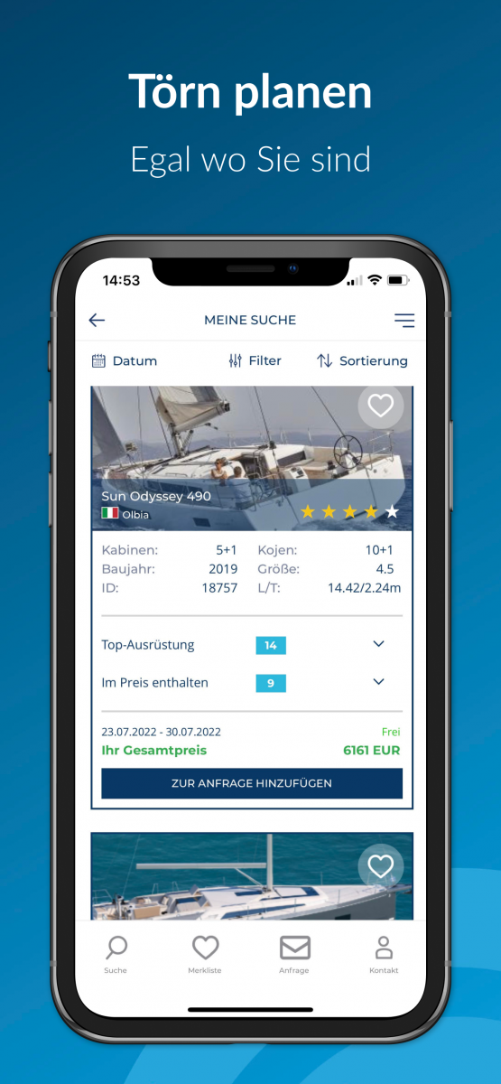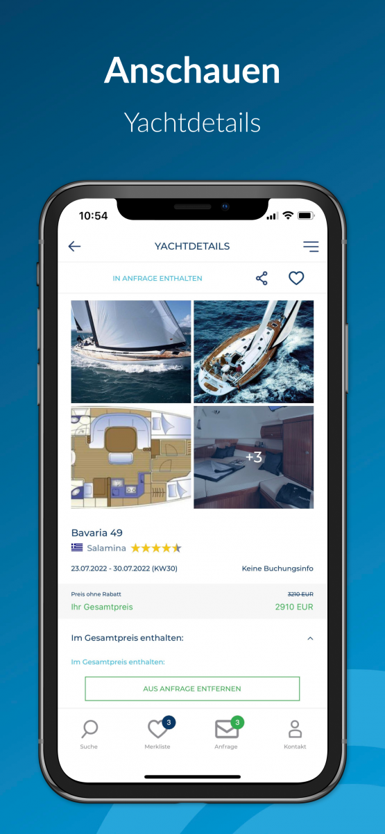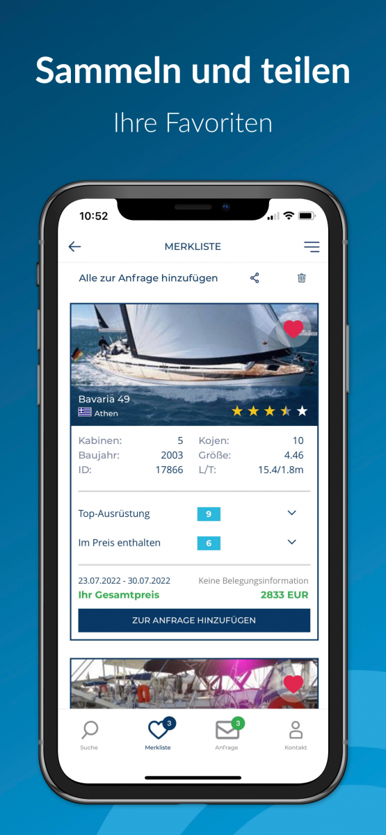Sie können die Yachten aus der Ergebnisliste mit einem Klick zu Ihrer Merkliste hinzufügen. In der Merkliste haben Sie dann nur noch Ihre Favoriten im Überblick. Teilen Sie Ihre Merkliste mit Ihrer Crew über Chat- und Messengerdienste.