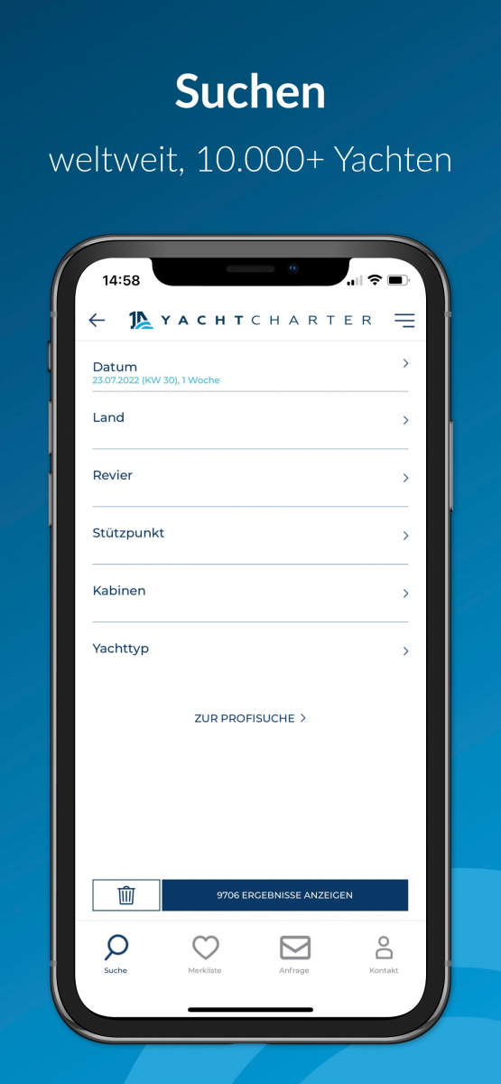 Mithilfe von Filterkategorien können Sie aus unserem umfangreichen Angebot Ihre Lieblingsyachten finden. Bei der einfachen Suche stehen Ihnen Land, Revier, Stützpunkt, Kabinenanzahl und Yachttyp zur Verfügung. Haben Sie schon weitere konkrete Wünsche, können Sie in der Profisuche auch Länge, Modell, Werft, Ausrüstung, Nasszellen, Tiefgang, Art der Steuerung, Bewertung oder Skipper-Kabinen auswählen.