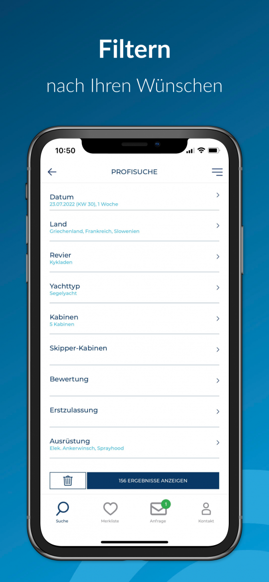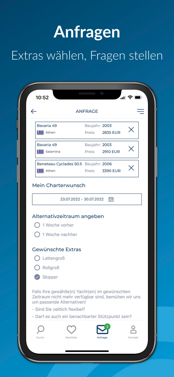 Fügen Sie die Yachten aus der Ergebnisliste oder Merkliste mit einem Klick zu Ihrer Anfrage hinzu. Sie können in der Anfrage einen Alternativzeitraum angeben, falls die Yacht belegt sein sollte. Wählen Sie gewünschte Extras dazu und schicken Sie eine Nachricht mit Ihrer Anfrage. Als Kontaktdaten brauchen Sie lediglich Ihren Namen und Ihre Email-Adresse für die Bearbeitung der Anfrage anzugeben.