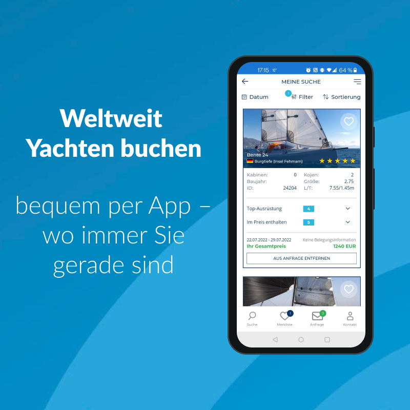Und schon sind Sie fertig! Es gibt sie sowohl für iOS als auch für Android. Laden Sie die 1aYachtcharter-App im Appstore oder bei GooglePlay herunter und planen Sie Ihren Törn mit uns, wo Sie auch sind. Natürlich stehen wir Ihnen auch telefonisch und per Email zur Verfügung, falls Sie weitere Fragen zu Ihrer Anfrage haben.