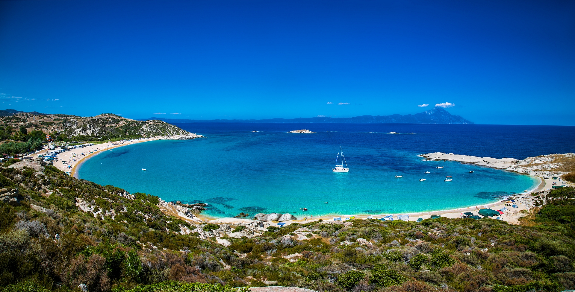 Karibisches Feeling kommt in der Bucht von Vourvourou um die Inselgruppe Diaporos auf. Viele kleine Buchten mit türkisfarbenem Wasser laden zum Baden und Schnorcheln ein.
