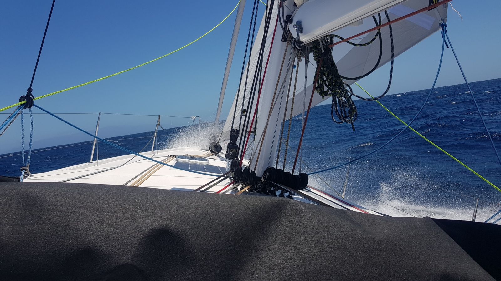 Die Rückfahrt von El Hierro nach San Sebastián de La Gomera begann gegen 09:30 Uhr und entwickelte sich zu einem anspruchsvollen, aber lohnenden Segeltag. Bei nördlichen bis nordwestlichen Winden waren häufige Kreuzschläge nötig – teilweise mit einem Wendewinkel von über 120°, bedingt durch Strömungseinflüsse. Besonders herausfordernd war erneut der Windschatten von Gomera: Trotz fehlendem Wind herrschte dort spürbare Welle, was das Vorankommen erschwerte.
