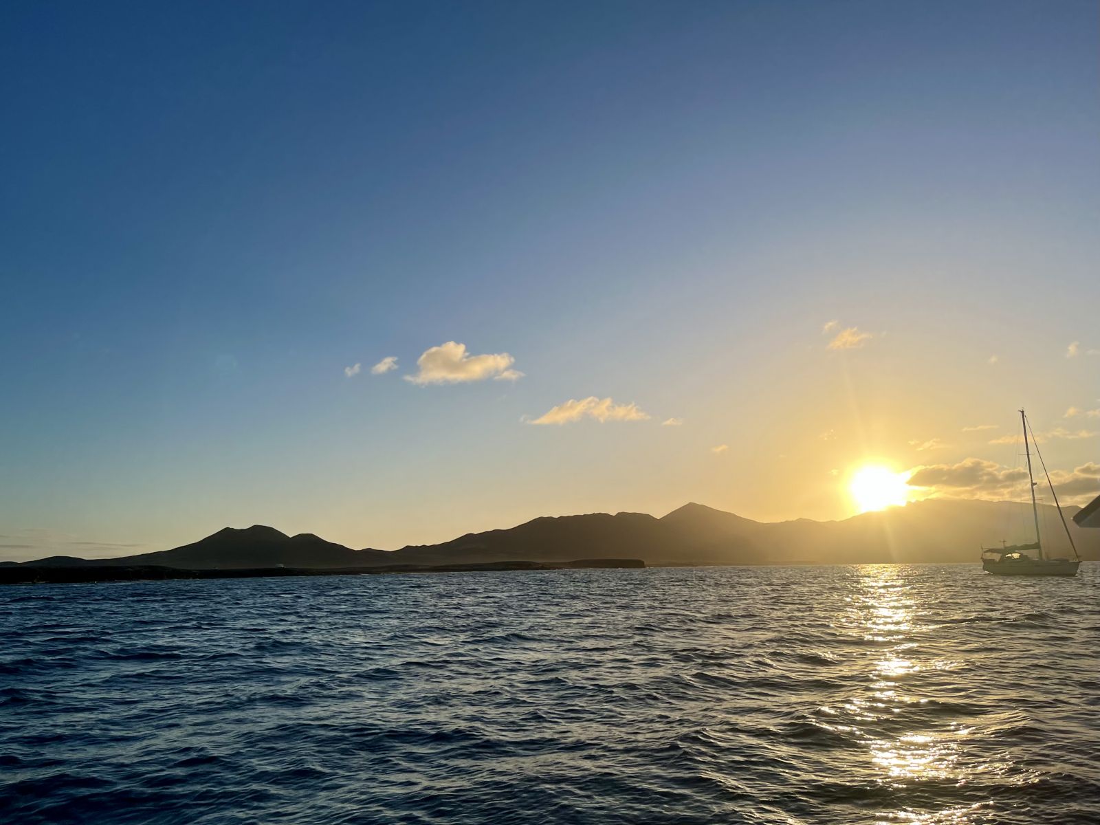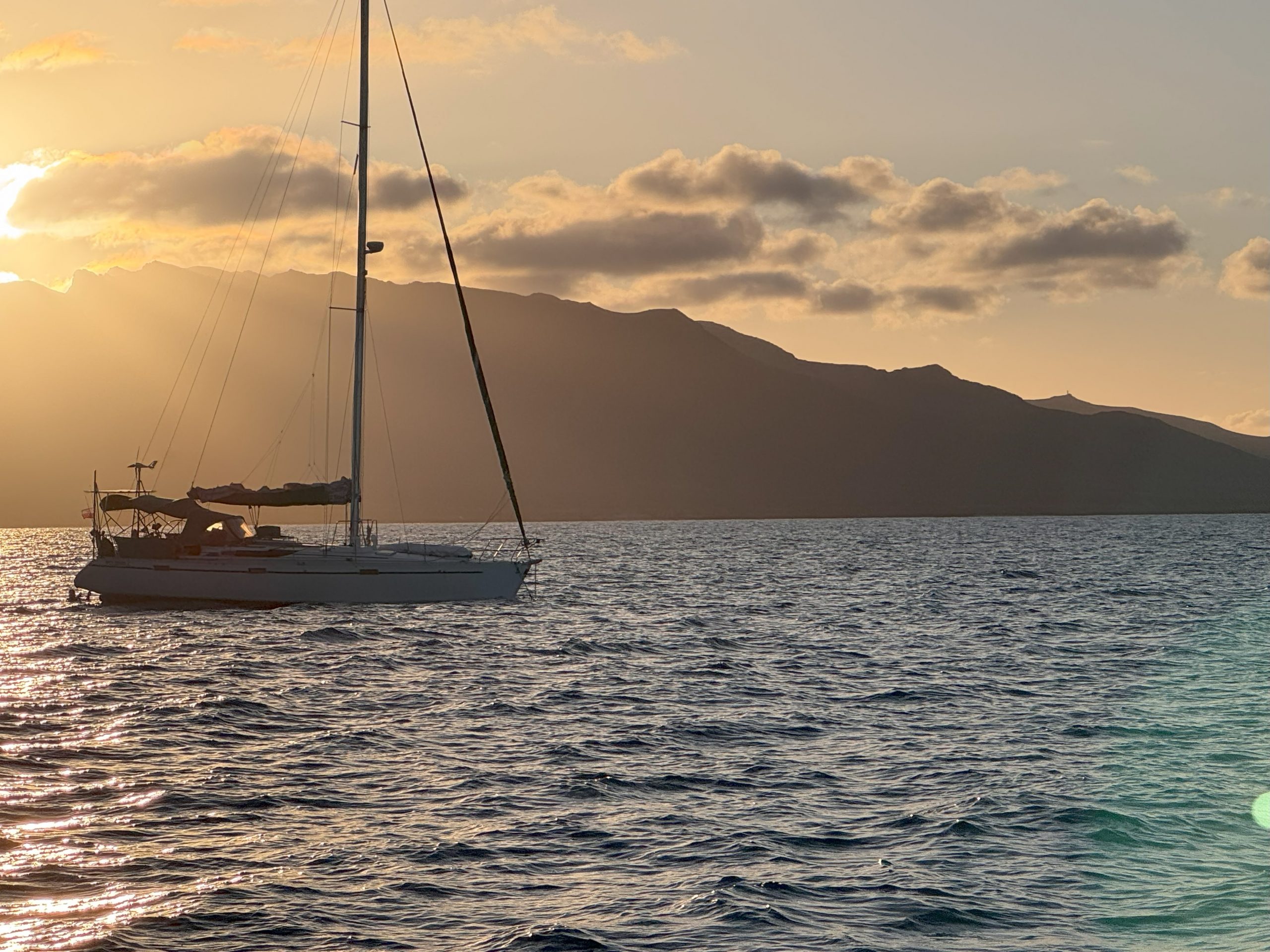 Um 12:30 Uhr verließen wir unseren Liegeplatz. Knapp 50 Minuten später setzten wir die Segel. Dabei verabschiedete sich ein Mastrutscher. Nach kurzer Rücksprache mit dem Eigner der Yacht gab es Klarheit und das Segel wurde weiterhin voll belastet. Der Wind flachte stündlich ab, sodass wir uns 13 nm vor unserem Ziel mit 4,5 Knoten Wind entspannt auf das Ankern und den Abend vorbereiteten. Gegen 22:00 Uhr warfen wir den Anker und waren glücklich über unsere Entscheidung, Corralejo erst am letzten Tag anzusteuern.