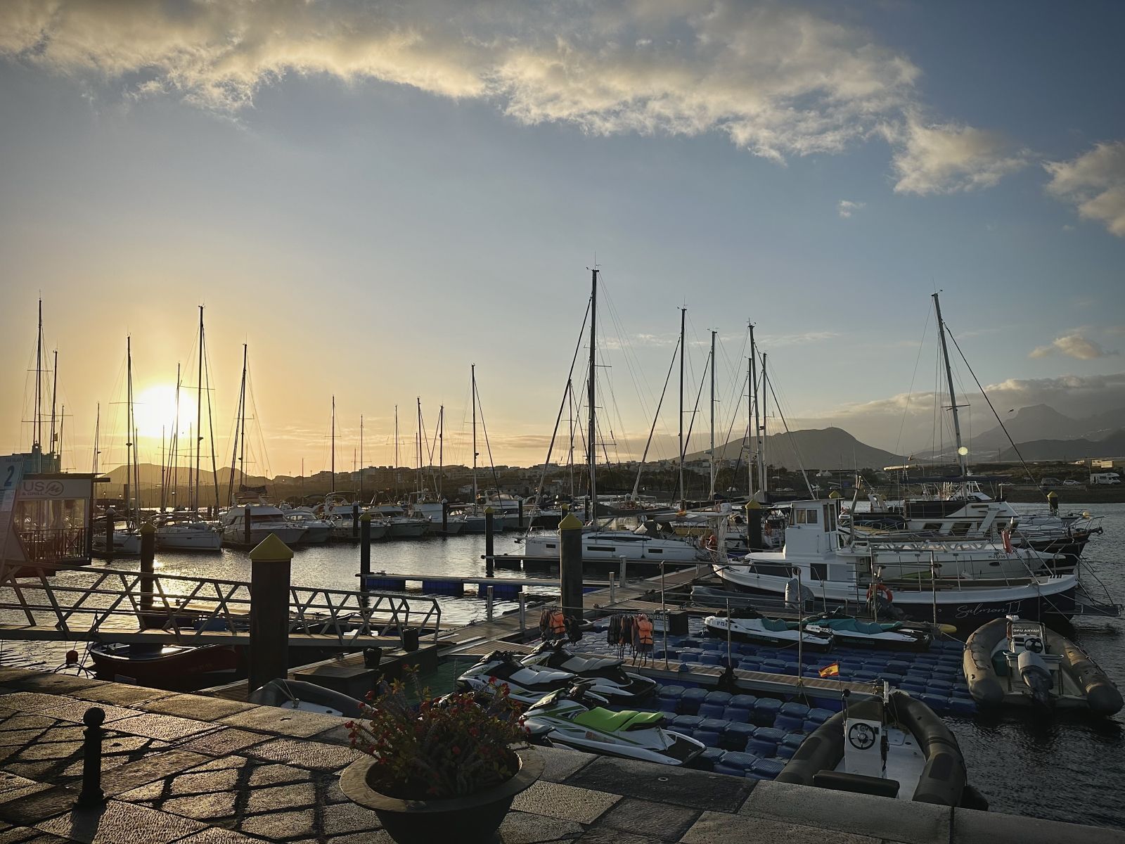 Unsere vorläufige Liegeplatzanfrage blieb unbeantwortet, weshalb wir per Funk Kontakt aufgenommen haben. „Corralejo is broken“ lautete die unerfreuliche Rückmeldung. Angeblich war die Marina gesperrt. Somit fiel unser geplanter Ausflug nach Corralejo sprichwörtlich ins Wasser. Das Restaurant „Cofradia de Pescadores“ wäre ansonsten unser Ziel für den Abend gewesen. Es ist jetzt nicht herausragend, aber in den vergangenen Jahren hatte es ein gutes Preis-Leistungs-Verhältnis, mit sehr freundlichem Service. Der Marinero am Funk empfahl uns, vor der Marina zu ankern. Erfahrungsgemäß ist der Schwell relativ heftig, weshalb wir uns widerwillig darauf einließen. Wir überlegten zwar noch nach Lobos auszuweichen, beließen es schlussendlich beim Ankern. Um 23:00 Uhr lagen wir zwar relativ unruhig, aber fest vor der Marina. Die Nacht war ruhiger als erwartet, sodass es keinen Grund zur Beunruhigung gab.
