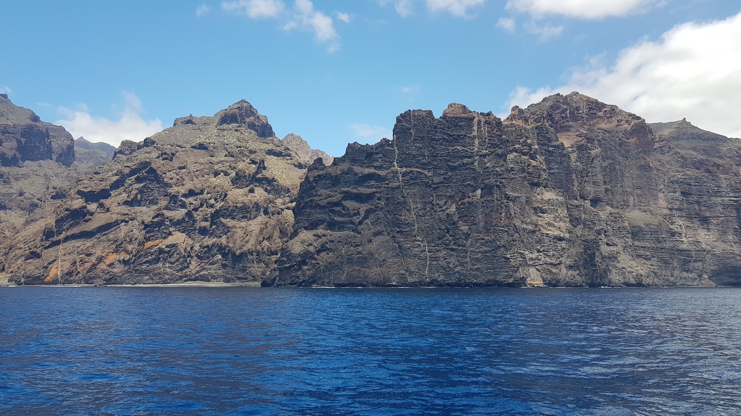 Am nächsten Tag segelte die Crew an der spektakulären Steilküste von Los Gigantes entlang – ein Wunsch vieler Mitsegler. Die imposanten Felswände, die direkt aus dem Atlantik aufsteigen, boten einen eindrucksvollen Anblick. Da der Wind in diesem Küstenabschnitt häufig abflaut, musste zeitweise auch der Motor genutzt werden. Ein Einlaufen in den kleinen Hafen „Puerto de Los Gigantes“ war mit unserem Tiefgang (3,20 m) nicht möglich. Die Pogo 44 verfügt zwar über ein Kielschwert, welches die Hafeneinfahrt (bis 1,50 m) möglich gemacht hätte, dennoch wollten wir direkt nach Las Galletas.