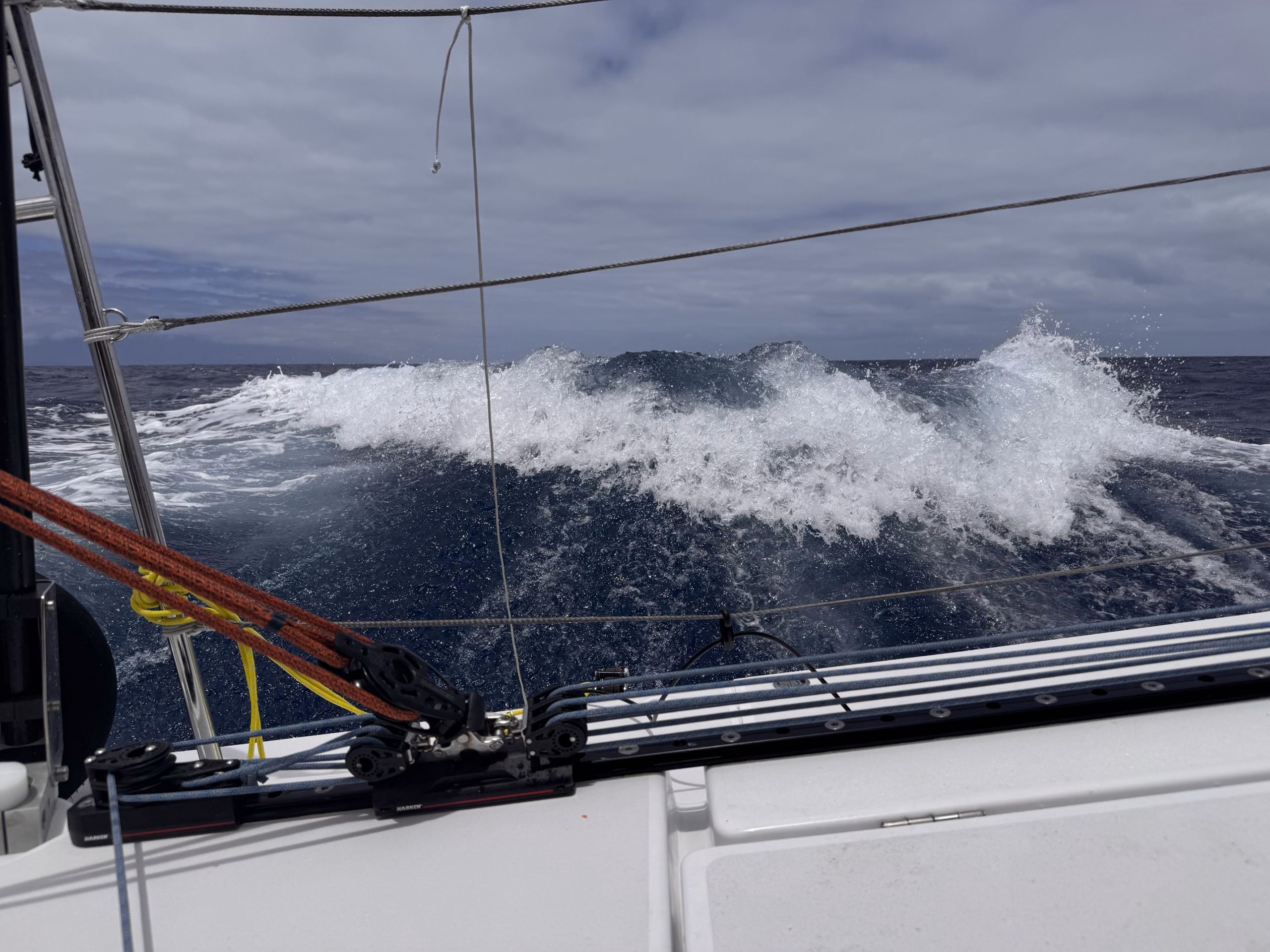Die Bedingungen erlaubten uns einen durchgehenden Segeltag, ohne auf die Maschine zurückgreifen zu müssen. Der Wind kam mit etwa 18–22 Knoten, in Böen mehr, das Boot lief hervorragend und die Crew war motiviert. Wir machten gute Fahrt – streckenweise über 10 Knoten – und genossen die letzte große Etappe dieses Turns.