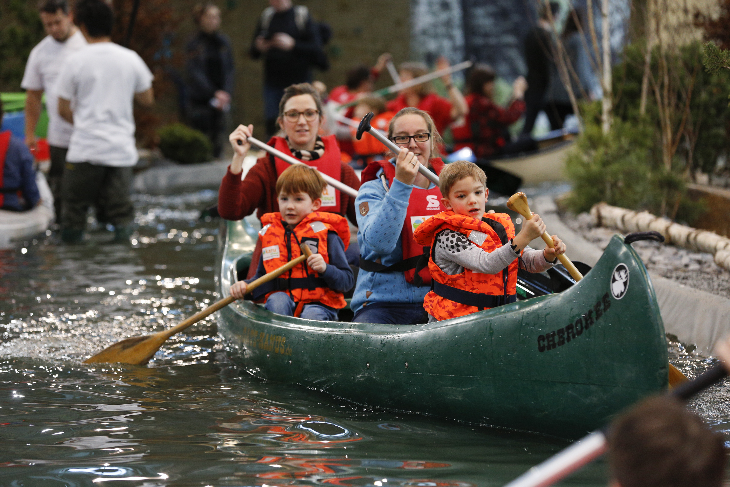 Alle Bilder: ©Messe Düsseldorf/ctillmannIn Halle 14 ist eine insgesamt 90 Meter lange Kanustrecke errichtet, auf welcher sich jeder im Paddeln versuchen kann. Sportlich geht es auch in Halle 8a in der Beach World weiter. Hier befindet sich „The Wave“, eine stehende Welle auf welcher man surfen kann. Am ersten Messewochenende finden hier die „Wave Masters“ statt und am zweiten die „SUP Wave Masters“. Die Vergabe der Zeiten für Besucher zum Ausprobieren der Welle (ab 8 Jahren) ist bereits im Vorfeld gelaufen, aber es werden während der Messe noch wenige freie Slots verlost (Infos am Anmeldetresen). Auch Stand-Up-Paddles und Skimboards können ausprobiert werden, alle Informationen hierzu bekommt man ebenso am Anmeldetresen von „The Wave“. Früh sein lohnt sich hier, bereits ab 10 Uhr werden freie Plätze vergeben. Wer keinen freien Slot bekommen hat, der muss nicht traurig sein, auch an Land gibt es einige der Wassersportattraktionen zum Austesten. Auf Balanceboards kann das Gleichgewicht trainiert werden und im Simulatorpark in Halle 8a können unter Anleitung u.a. SUP’s und Kites ausprobiert werden, ohne zuvor in die Badehose zu schlüpfen. Dennoch ist es ratsam, Wechselklamotten einzupacken, auch für die Kleinsten. Es gibt so viel rund ums Wasser zu entdecken, dass das ein oder andere Paar Socken oder die Hose auch mal in Mitleidenschaft gezogen werden kann.
