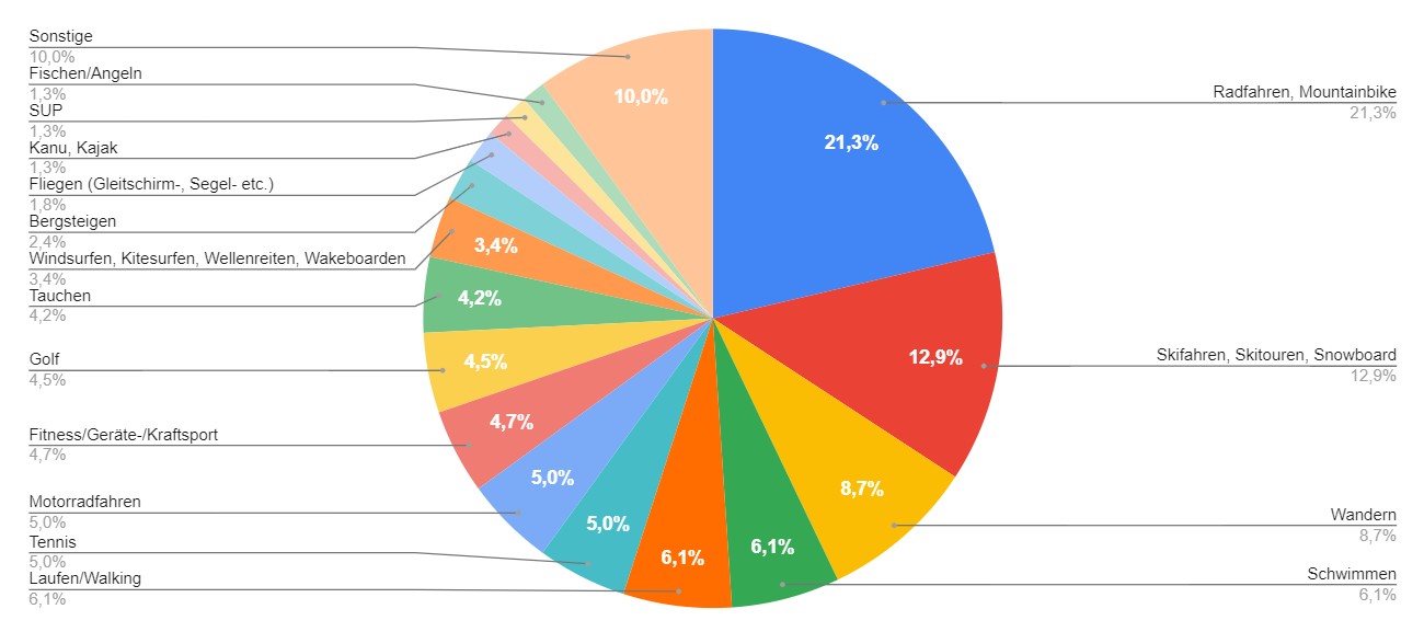 Bei dieser Frage wurde häufig mehr als eine Antwort gegeben. Im Bereich „Sonstige“ sind alle Einzelwerte kleiner als 1%, Antworten waren zum Beispiel Klettern, Fußball, Reiten, Skaten, Yoga oder Triathlon.