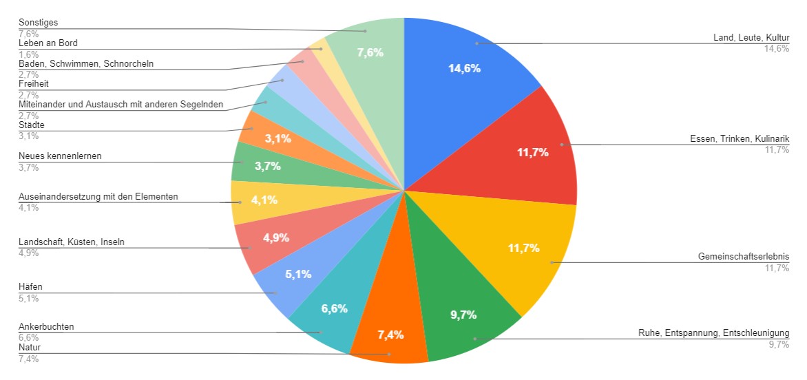Bei dieser Frage wurde ebenfalls häufig mehr als eine Antwort gegeben. Im Bereich „Sonstige“ sind alle Einzelwerte kleiner als 1%, Antworten waren zum Beispiel, nicht am Massentourismus teilzuhaben, Abwechslung/Vielfalt, Sprachen, Museen/Sehenswürdigkeiten, Törnplanung oder der Perspektivwechsel von Wasser aus aufs Land.