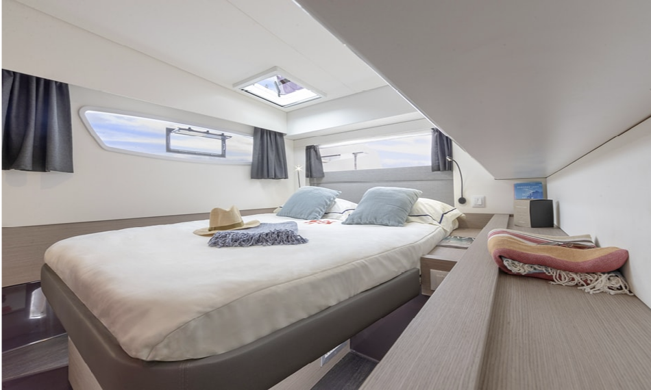 Alle Bilder: Fountaine PajotDie Kabinen unter Deck sind hell und geräumig, mit einer Menge Möglichkeiten an Stauraum. Die Betten sind von beiden Seiten zugänglich. Die Inneneinrichtung ist neben Weiß auch in hellem Grau und Braun gehalten, sodass es nicht kalt sondern warm wirkt. Die Kabinen verfügen je nach Ausführung über eigene Nasszellen mit abgetrennter Duschkabine und separater Toilette.