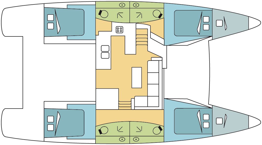 Den Elba 45 gibt es als 3-Kabinen-Version, in der die Eignerkabine am Rumpf groß ausfällt, oder als 4-Kabinen-Version. Je nach Ausführung kommen auch noch eine Skipperkabine oder zwei kleine Ein-Mann-Kabinen im Bug dazu.