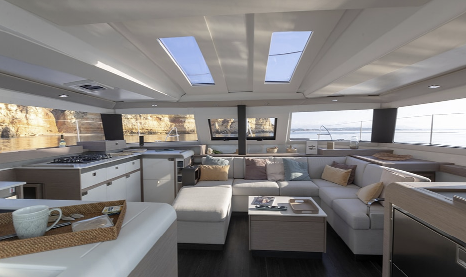 Alle Bilder: Fountaine PajotWenn man die großen Schiebetüren zwischen Außencockpit und Salon öffnet, bilden beide Räume eine Einheit und es gibt gleich mehr Bewegungsspielraum zwischen Innen- und Außenbereich. Zusammen mit den Luken ergibt sich eine gute Ventilation. Der Außenbereich ist überdacht, sodass auch bei schlechtem Wetter alle trocken bleiben. Wahlweise kann man auch noch eine Rundumverkleidung anbringen. Am Tisch aus Teakholz finden bis zu neun Personen Platz. Das große Frontcockpit bietet viel Liegefläche zum Entspannen und Sonnen. Es gibt sie wahlweise auch mit Polsterung, die man von einer Sitz- in eine Liegefläche verwandeln kann. Auf dem Deck befinden sich ebenfalls viele Möglichkeiten an Stauraum.