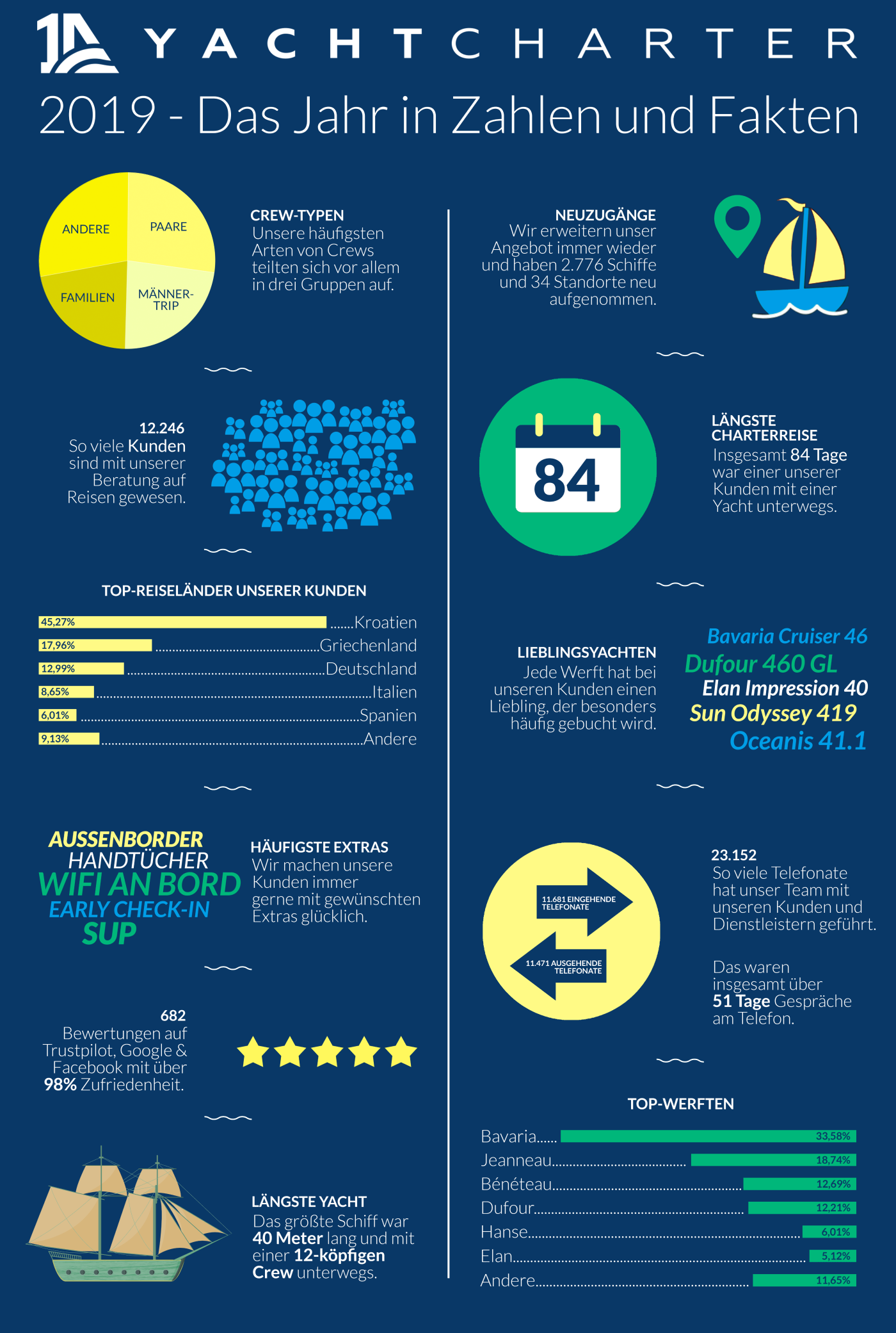 In unserer Infografik finden Sie die Topreiseländer unserer Kunden, die beliebtesten Yachten, wie lange die längste Charterreise dauerte und vieles mehr. Das Jahr 2019 in Zahlen und Bildern, bunt und auf einen Blick! (Bitte auf das Bild klicken für bessere Lesbarkeit)