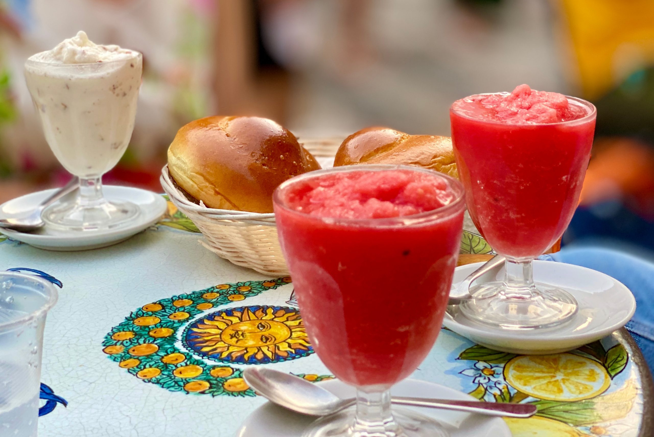 Eis zum Frühstück? In Sizilien ist das ganz normal. Granita, die sizilianische Version des Sorbets, gibt es auf der Insel schon seit Jahrhunderten und geht in seinen Ursprüngen wohl auf die Zeit zurück, als Sizilien ein muslimisches Emirat war (831 bis 1091). Die neuen Herrscher brachten Wohlstand auf die Insel und haben bis heute spürbaren Einfluss auf die sizilianische Küche. Und sie brachten ein mit Rosenwasser aromatisiertes Kaltgetränk mit, die Urform des Sorbets. Im 11. Jahrhundert begannen die Sizilianer dann, den Schnee des Ätna und anderer Gipfel zu sammeln und zu lagern. Hierzu entstand eigens der Beruf des Nivaroli, die den Schnee in Höhlen und Schneehäusern einlagerten. So konnte die Oberschicht der Insel im Sommer das erste mit Sirup überzogene Eis genießen. Als im 16.Jh. dann die ersten Eismaschinen entwickelt wurden, entstand die moderne Granita mit ihren vielen regionalen Geschmacksrichtungen. Zunächst Zitrone, Jasmin und Maulbeere, später kamen Pistazie, Kaffee und Erdbeere, dann auch Orange, Mandel und Minze hinzu. Dazu gab es z.B. Butterkekse oder Griessbrot, das sizilianische Sommerfrühstück war geboren. Heute hat sich die lokale Version der Brioche als Beilage durchgesetzt, erkennbar am “tuppo”, dem “Gipfel”. Natürlich können Sie die Granita auch zu anderen Tageszeiten genießen, eine klassische Nachspeise ist sie auf Sizilien aber eigentlich nicht.