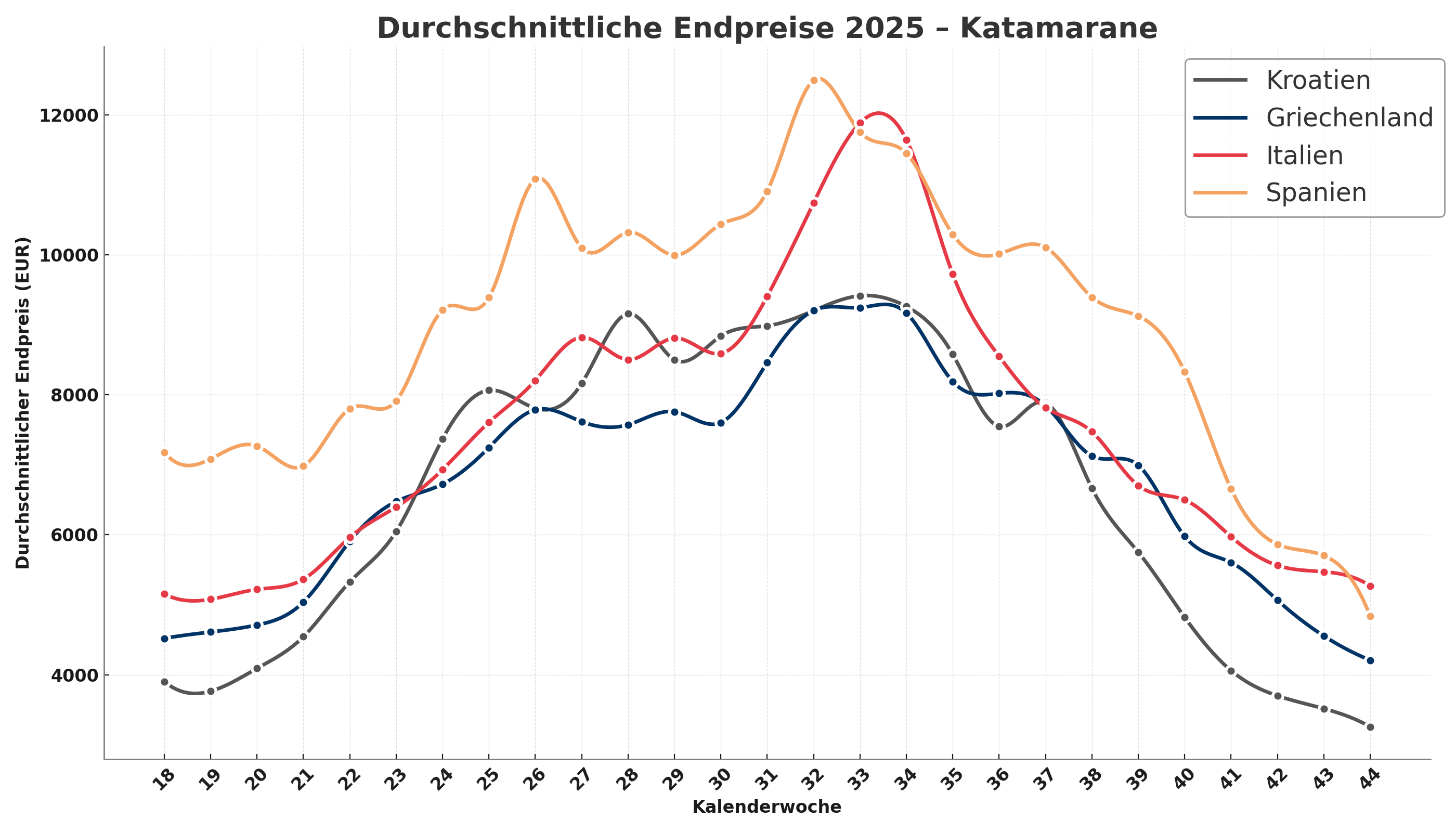 - Italien und Griechenland liegen preislich relativ nah beieinander, insbesondere für Katamarane, wobei Italien zeitweise etwas teurer wird.