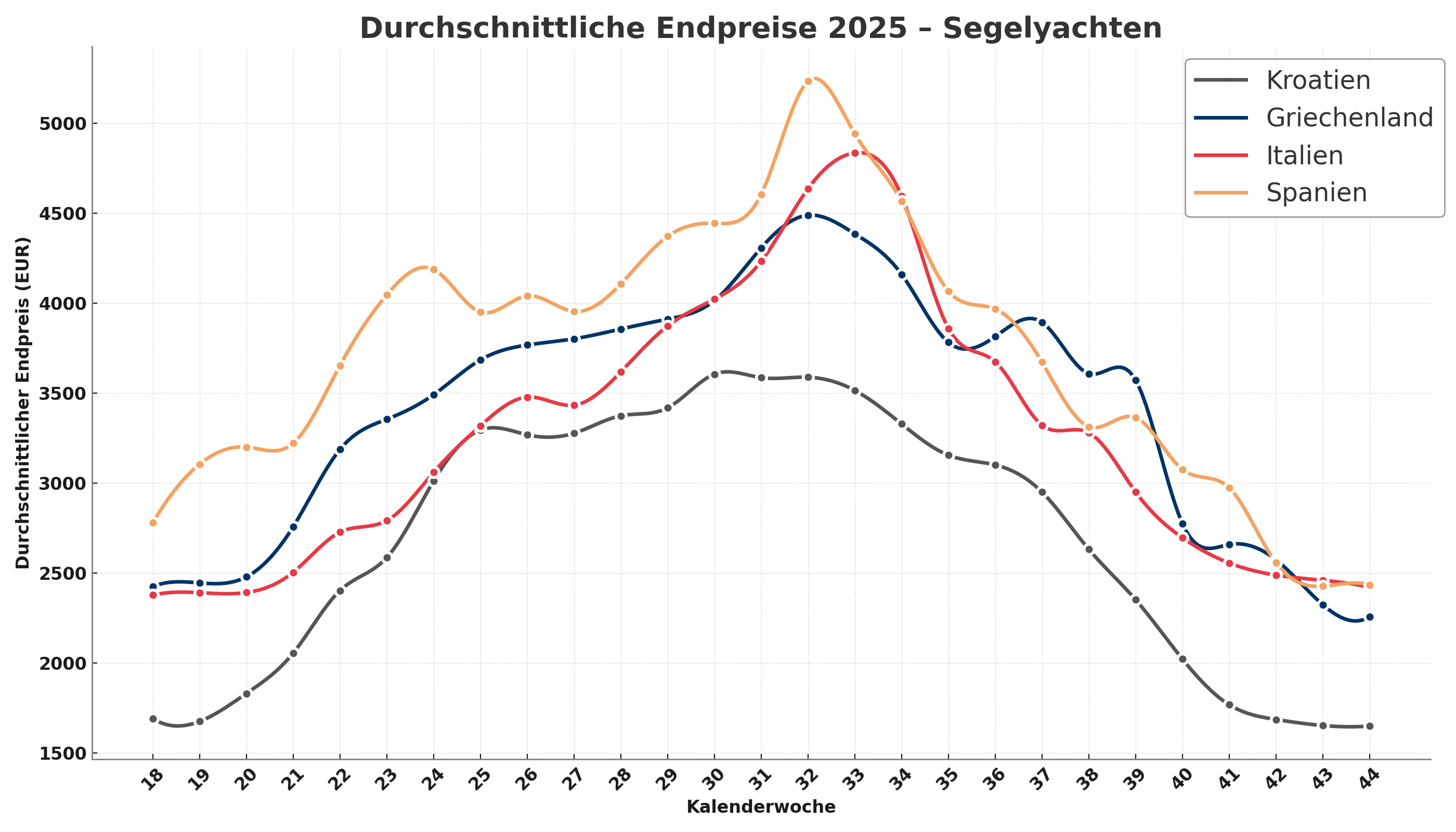 ➡ Tipp: Preisbewusste Segler sind mit Kroatien oder Griechenland in KW 30–35 am besten bedient. Wer nach KW 36 reist, findet attraktive Optionen in Italien.
