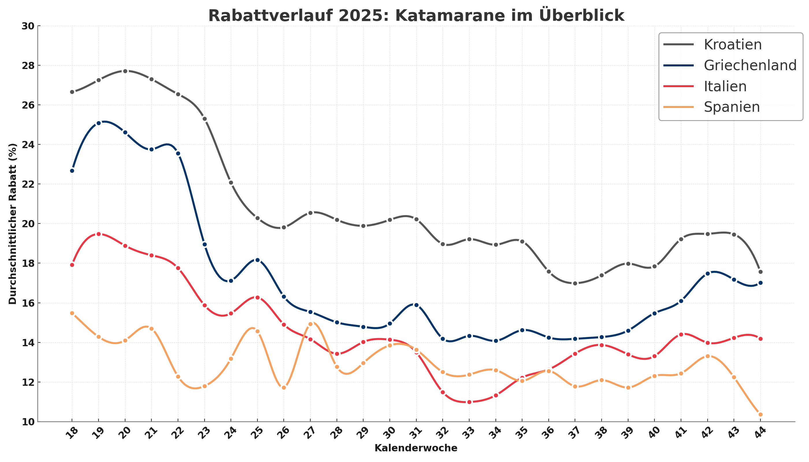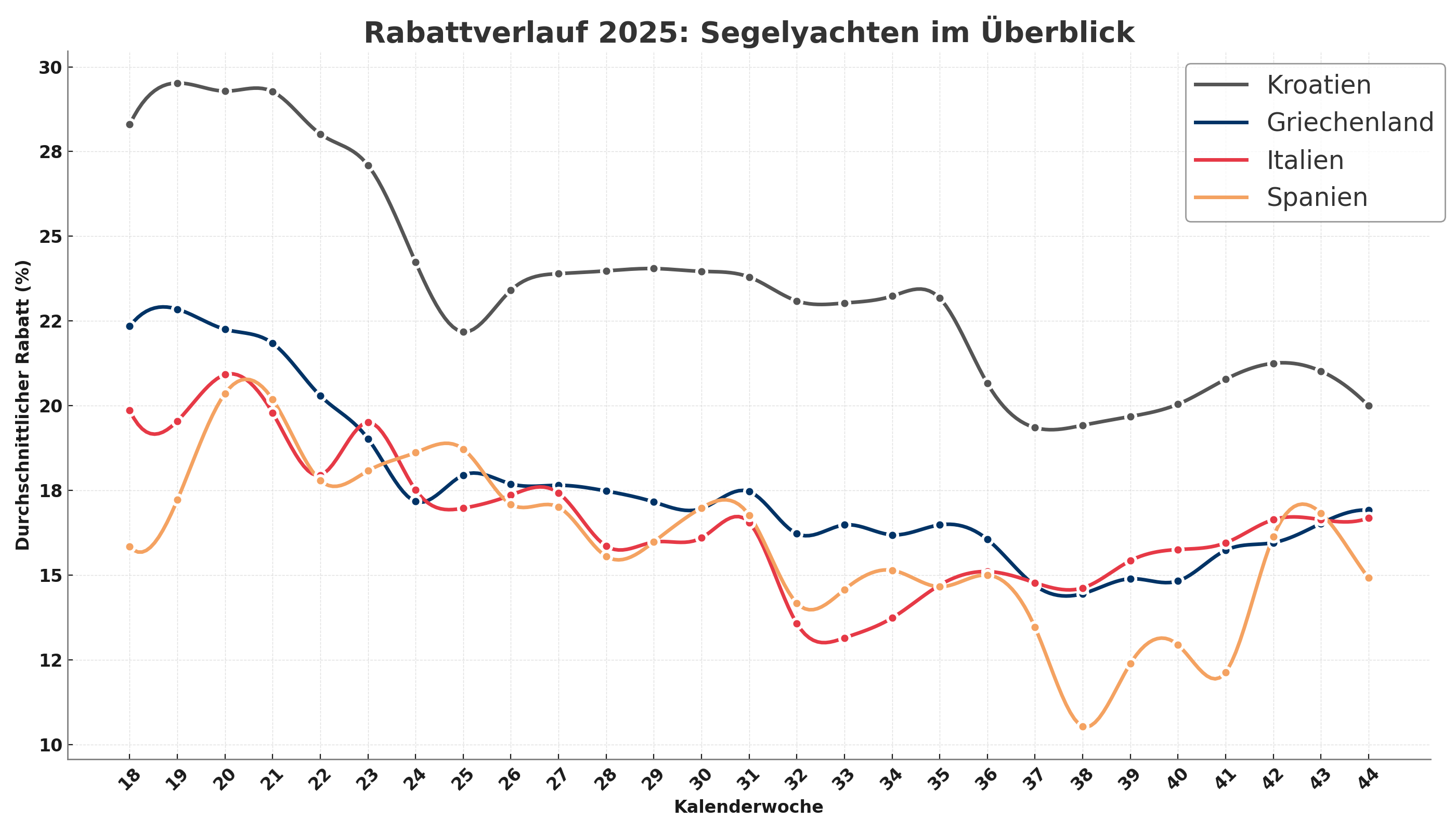 - Griechenland bietet ebenfalls attraktive Rabatte, vor allem auf Katamarane, die stabil zwischen 20-24% liegen. Bei Segelyachten schwanken die Rabatte stärker, bleiben jedoch in einem attraktiven Bereich um die 18-20%.
