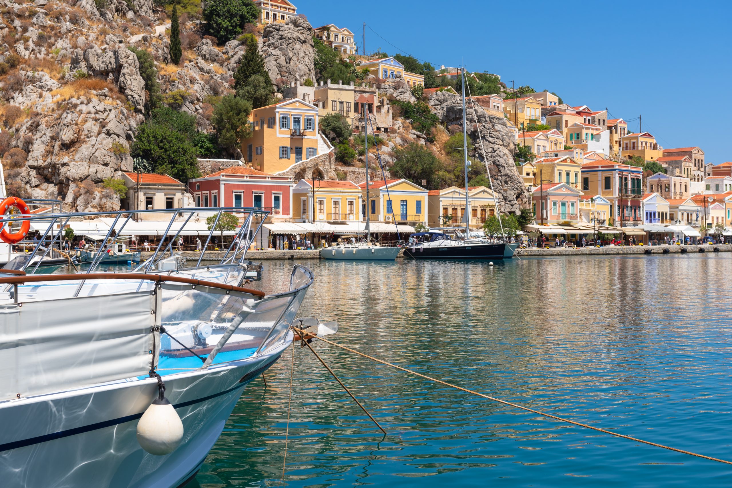 Symi liegt ca. 20 Seemeilen von Rhodos entfernt. Die Insel ist mit ihren vielen Ankerbuchten ohnehin ein Seglerparadies, besonders malerisch ist jedoch der Haupthafen im Norden. Die farbenfrohen Gebäude scheinen geradezu aus der felsigen Umgebung hinauszuwachsen, vom Boot aus bietet sich so eine tolle Kulisse. Rund um den Hafen reihen sich Tavernen und Cafés, unter deren schattigen Markisen es gut ein paar Stunden auszuhalten ist. Wenn es nicht zu heiß ist, lohnt sich der Besuch der Oberstadt, die über die 500 Treppenstufen der Kali Strata zu erreichen ist. Hübsche Häuser, kleine Restaurants und Geschäfte und nicht zuletzt tolle Ausblicke auf den Hafen sind die Belohnung für den Spaziergang, der hinauf zum Syllogos-Platz führt.