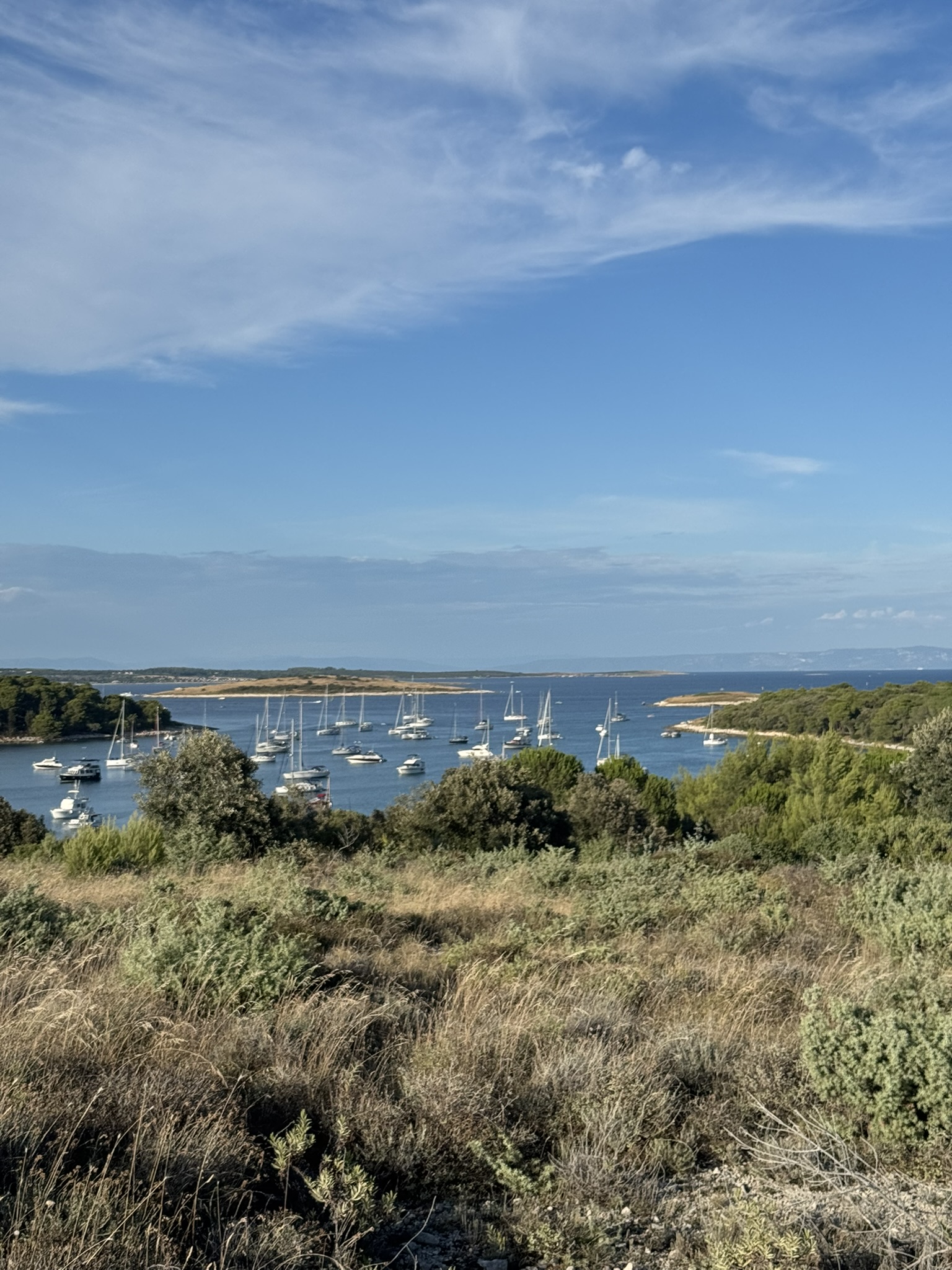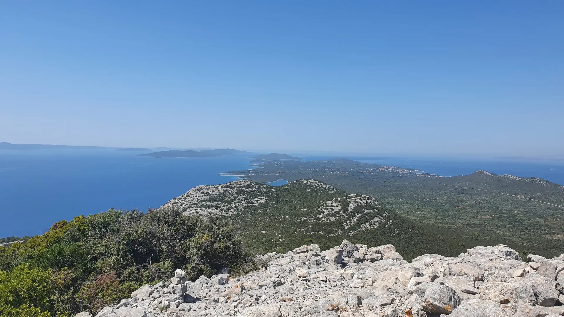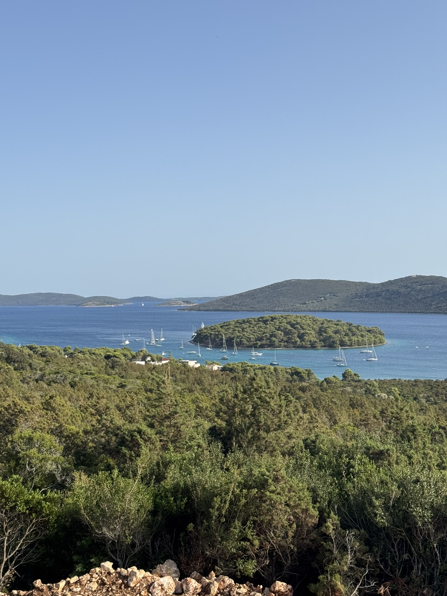 Der Tag begann für mich wieder mit einer Laufrunde – dieses Mal deutlich anspruchsvoller als auf Susak. Direkt hinter der Bucht führt ein markierter Wanderweg steil den Berg hinauf. Technisch würde ich ihn eher als T2–T3 einstufen, also Trittsicherheit ist gefragt. Teilweise klettert man über große Felsstufen, doch die Mühe lohnt sich: Von oben hat man einen fantastischen Ausblick über die Küste, die vorgelagerten Inseln und bis nach Zadar hinein. Die Wanderroute dauert vermutlich ca. 3 Stunden.