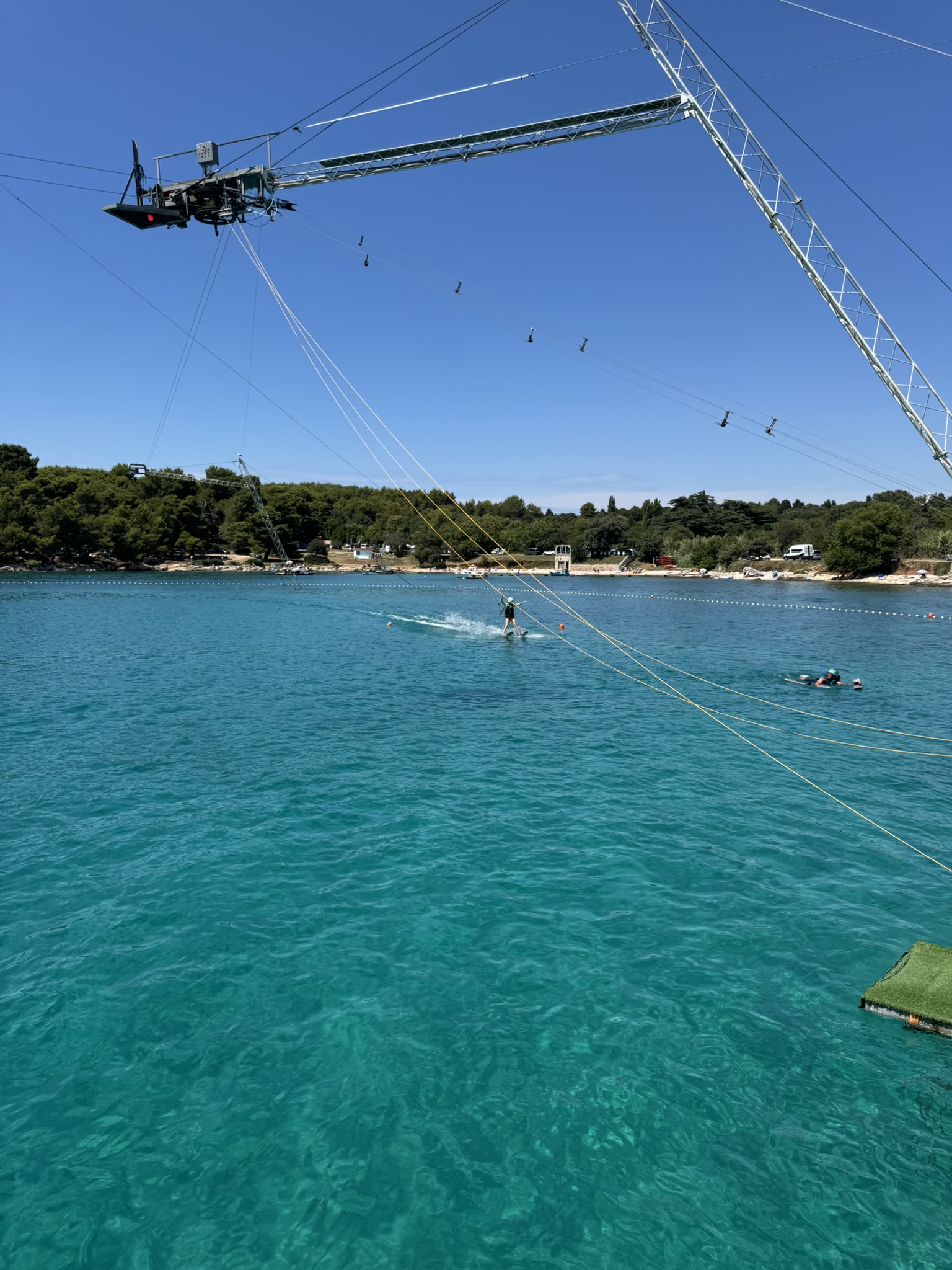 Da wir noch etwas Zeit hatten, bevor wir das Boot endgültig in die Marina zurückbringen mussten, machten wir einen Abstecher in die Bucht Uvala Stoja, westlich von Pula. Hier ankerten wir bei fast vollständiger Flaute. Die vorhandenen Bojen sollte man nicht nutzen, da sie von den Fischern genutzt werden. In der Nachbarbucht gibt es einen Wakeboard-Park. Mein Sohn und ich nutzten die Gelegenheit, uns auszutoben. Für rund 30 – 40 € pro Stunde und Person inklusive Ausrüstung war das ein gelungener Abschluss für uns.