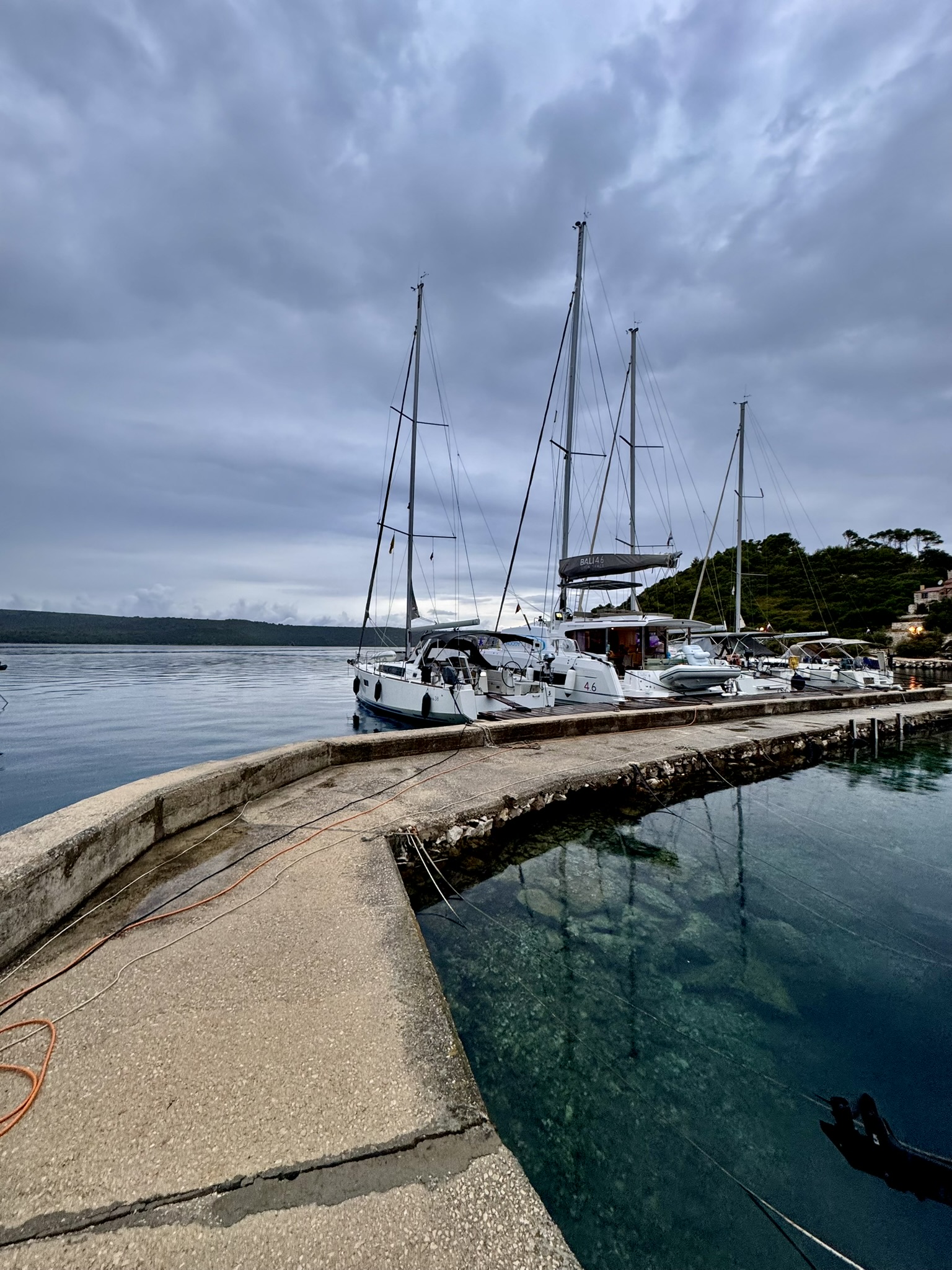 Am Morgen wollten wir in Zverinac auslaufen – doch das wurde zu einer echten Herausforderung. Beim Ablegen frischte die Bora auf. Die Luv-Heckleine blieb beim Ausrauschen in der engen Ring-Öse hängen, und eine Böe drehte das Boot quer. Zum Glück löste sich die Leine im letzten Moment, wir gewannen die Kontrolle zurück und konnten auslaufen. Unsere Empfehlung: beim Ablegen hier besser auf den Hafenmeister warten – die Ösen sind eng und die Leinen gleiten nicht gut hindurch. Erst als wir draußen waren, fiel die Anspannung ein wenig ab, aber uns war klar, dass dies ein fordernder Tag werden würde.