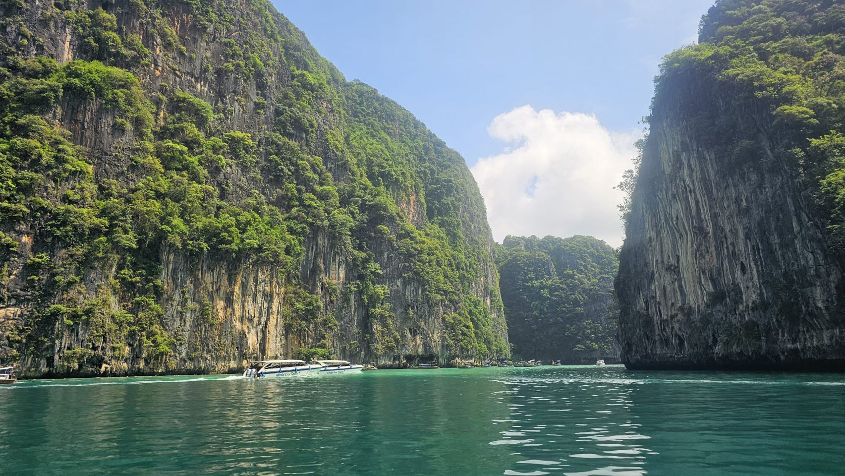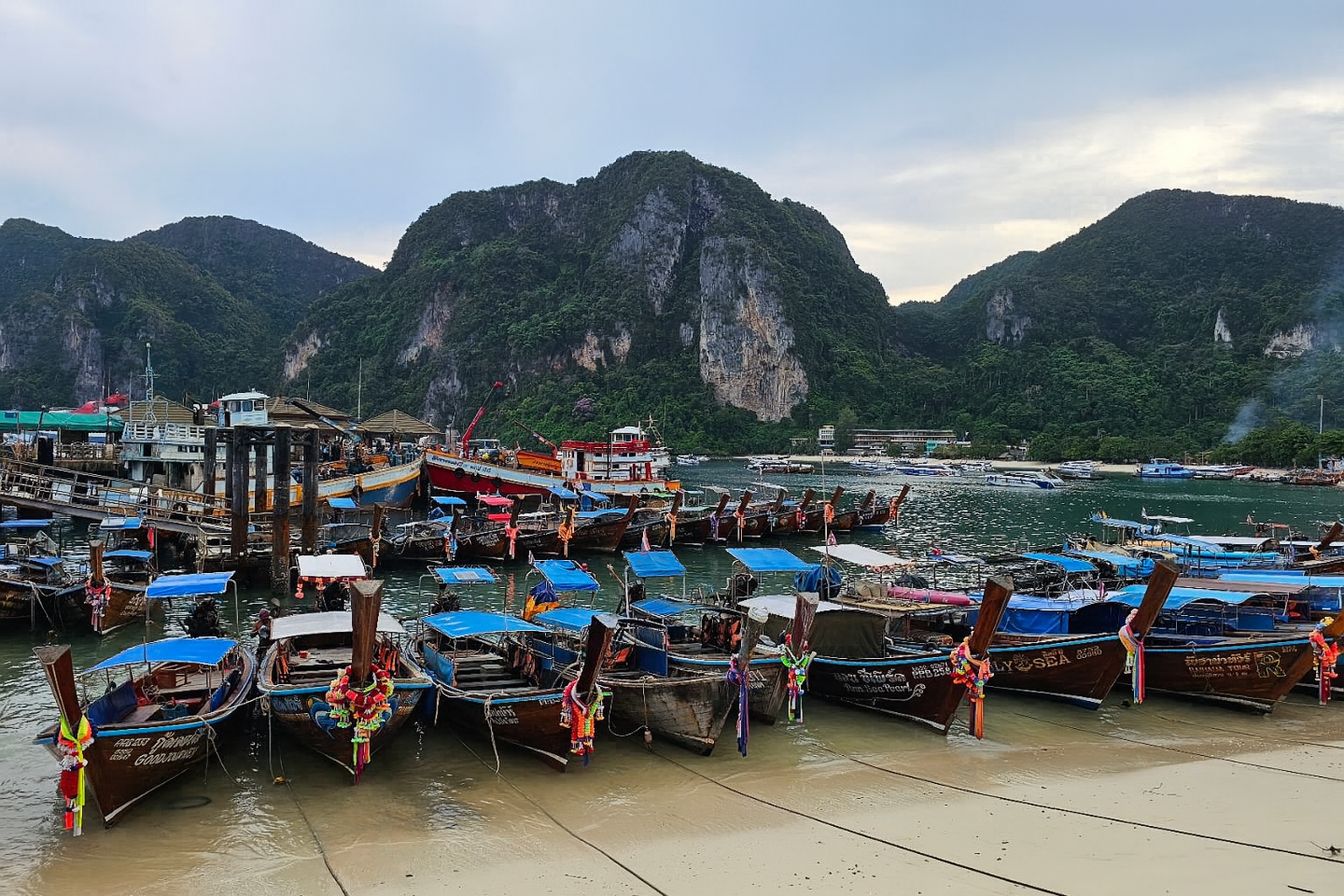 Schon bei der Ansteuerung ist klar: Hier weht ein anderer Wind. Die Buchten waren voll mit Speedbooten, Ausflugskatamaranen und knatternden Longtails. Parasailing-Schirme tanzten über dem Wasser, Bananenboote wurden kreischend durchs Meer gezogen, an Land wimmelt es von Touristen.