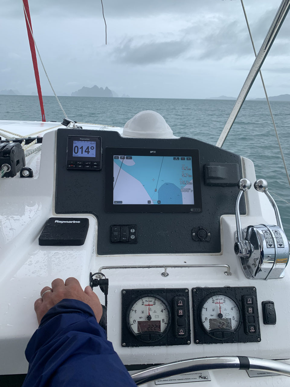 Der Tag begann mit einem erfrischenden Frühschwimmen, wie fast jeden Tag – doch dieses Mal wurde die Idylle unterbrochen: Ein kräftiges tropisches Gewitter zog plötzlich auf, Windböen pfiffen durch die Takelage, Regen prasselte auf das Deck. Zeit, sich ins Innere zurückzuziehen. Dort hielten wir das tägliche Briefing für den Tag ab – mit Seekarten, Zirkel und Kaffeetasse.