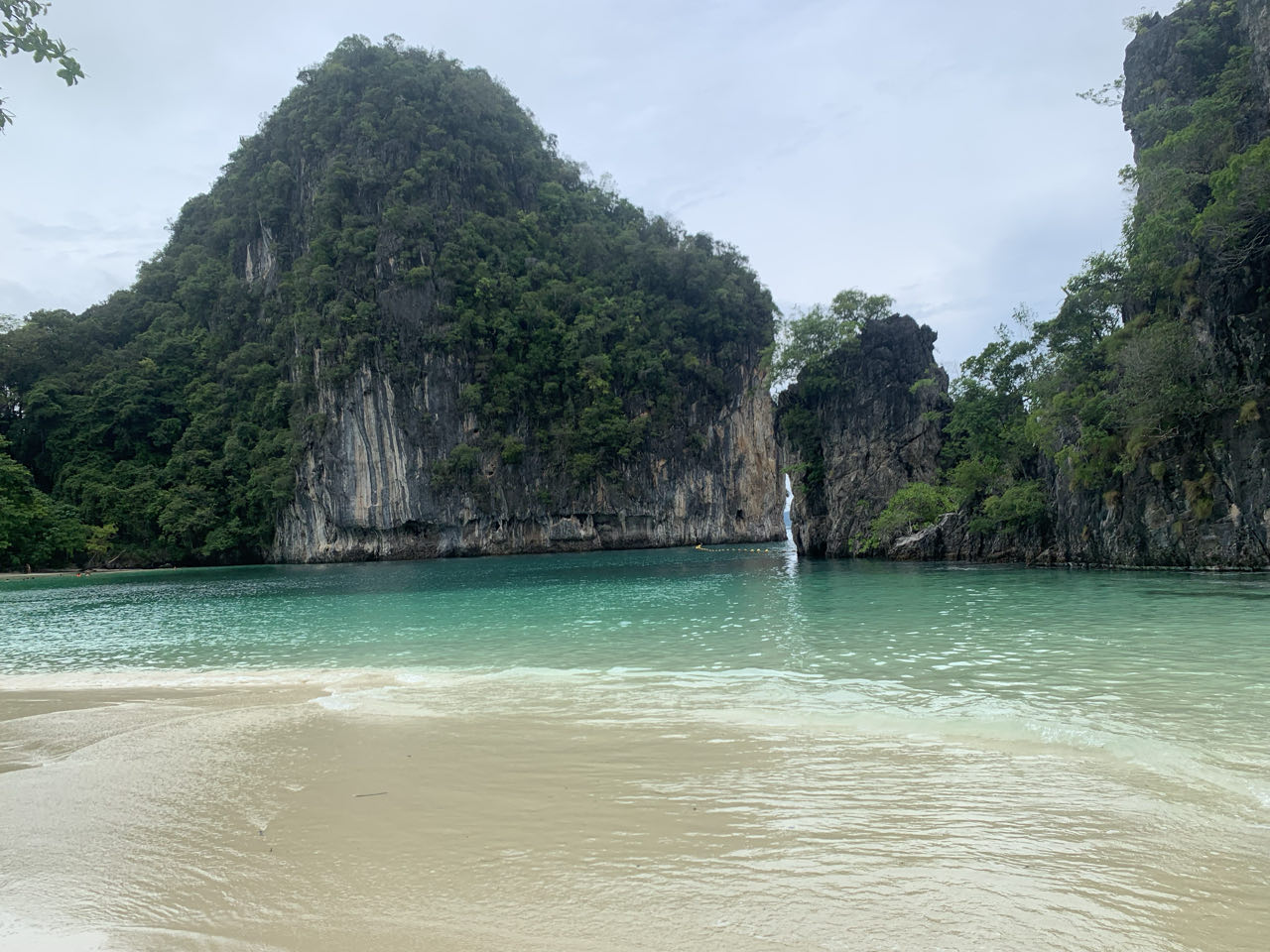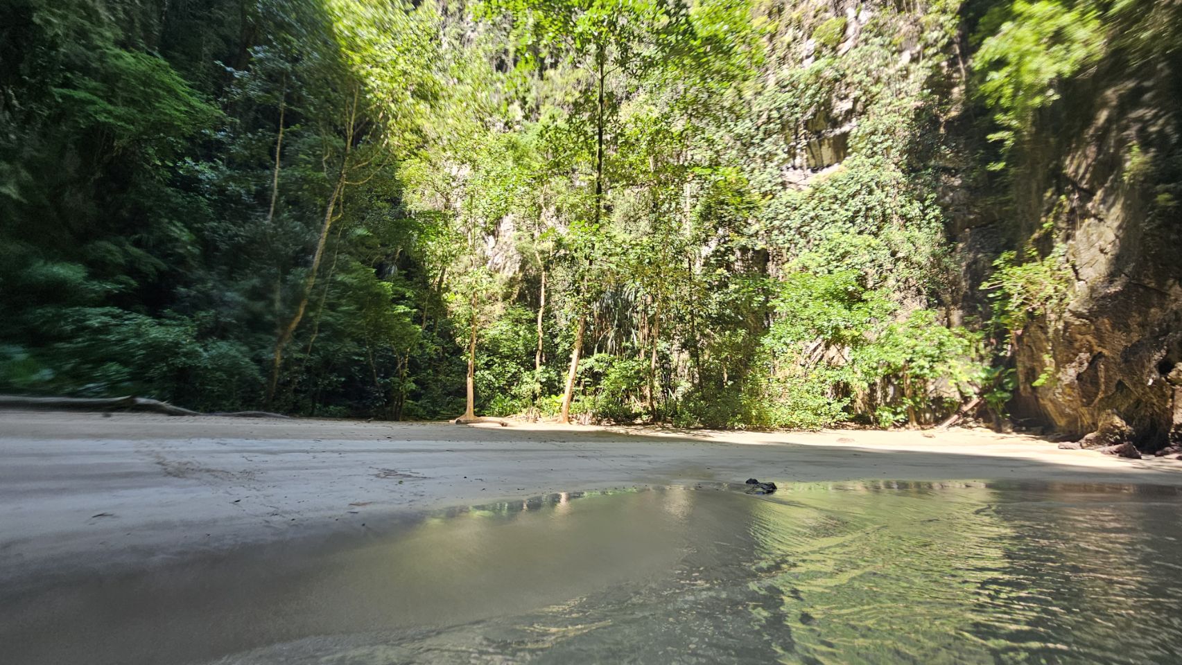 Nach einer ruhigen Nacht ging es am Morgen zurück nach Ko Muk – dieses Mal mit einem ganz besonderen Ziel: der berühmten Emerald Cave (Tham Morakot). Um den versteckten Strand im Inneren der Insel zu erreichen, muss man zunächst etwa 30 Meter durch eine dunkle Höhle schwimmen. Nur mit Stirnlampe oder Taschenlampe bewaffnet gleitete die Crew durch das dunkle Wasser, bis sich plötzlich eine smaragdgrüne Lagune öffnete – umgeben von steilen Felswänden und dichtem Dschungel. Ein magischer Ort, der seinen Namen völlig zu Recht trägt. Es ist zwar etwas unheimlich, doch lohnenswert.