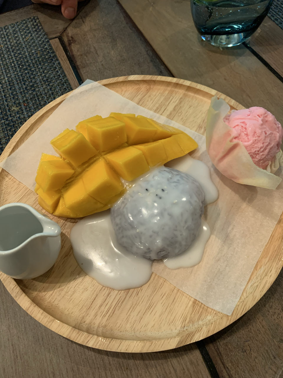 Am Abend war unser Katamaran, eine Sunsail 454L, übernommen, die Vorräte gebunkert und das Gepäck verstaut. Für ein erstes Abendessen gingen wir in das „Port of Call„. Das Essen war in Ordnung. Es lohnt sich, 10 Minuten Fußweg zu investieren und das „Hareefeen Restaurant“ zu besuchen. Nach dem Hauptgang genossen wir unseren ersten Mango Sticky Rice. Die Reise konnte beginnen.
