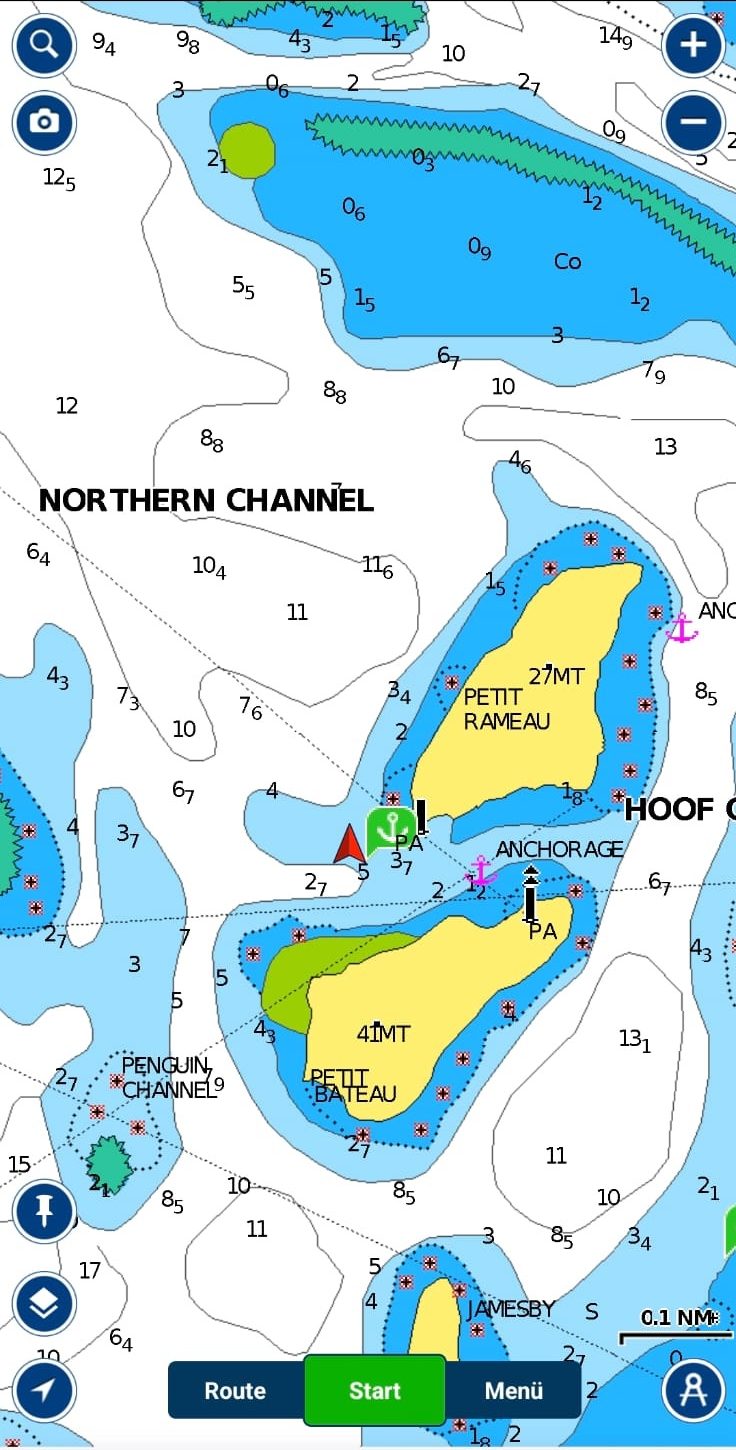 Für die 38 nm nach Canouan planten wir acht Stunden ein. Also legten wir am Morgen gegen 07:00 Uhr ab, um Charleston Bay bei Tageslicht zu erreichen. Wir erreichten die Bucht gegen 15:00 Uhr und ankerten. Die Doppelsteganlage ist zum Anlegen des Dinghys perfekt.