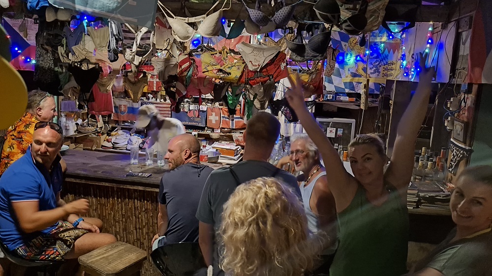 In der Nähe gibt es eine kleine Bar, in der noch Requisiten vom Filmdreh zu sehen sind (sowie weitere fragwürdige Dekorationen, siehe Bild). Ein Besuch lohnt sich dennoch, nicht nur für Filmfans. Die geplante Wanderung zum Vulkan La Soufrière mussten wir leider streichen – der Gipfel lag komplett im Nebel. Da wir die Tour bereits 2007 gemacht hatten, können wir sie aber jedem empfehlen: ein echtes Highlight!