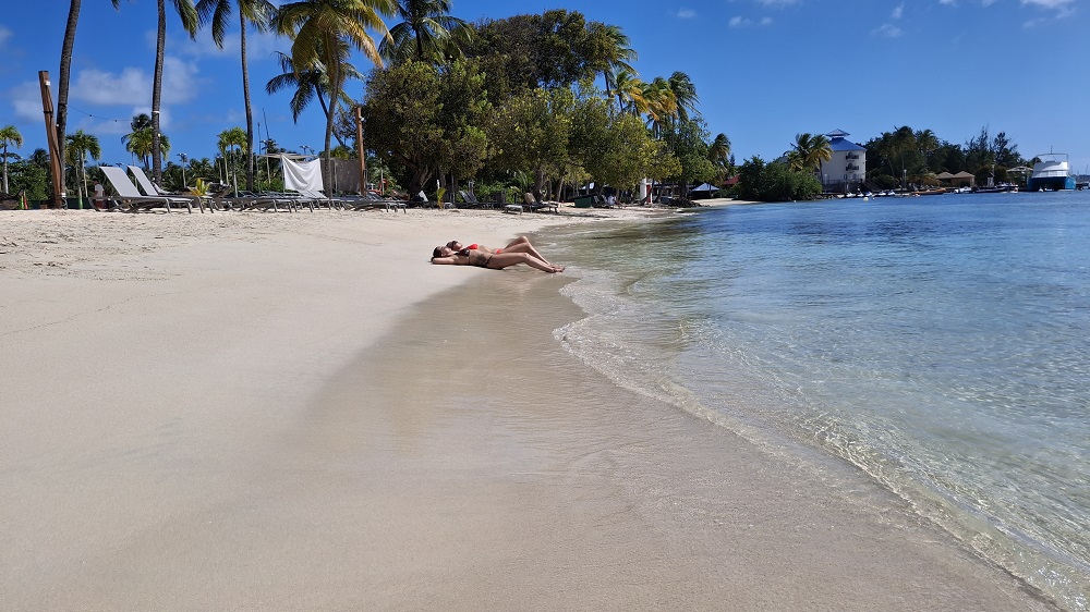 Der Strand von Le Diamant ist atemberaubend schön – weißer Sand, türkisfarbenes Wasser, perfekte Bedingungen für ein letztes Bad in der Karibik. Nach ein paar entspannten Stunden im Wasser brachen wir gegen 15 Uhr auf. Unser Ziel für den letzten Abend: die Ankerbucht Pointe Marin.
