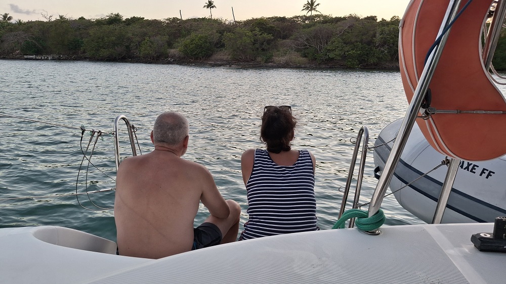 Die rund 10 Seemeilen motorten wir bei konstant 5 Knoten. Vor Ort erwartete uns erneut ein traumhafter Strand – Plage de Pointe Marin. Allerdings staunten wir nicht schlecht: Nur Hotelgäste durften Getränke an den angrenzenden Strandbars kaufen. Also genossen wir unseren letzten Sonnenuntergang ohne Kaltgetränk – aber mit Blick auf ein gelungenes Törnerlebnis.