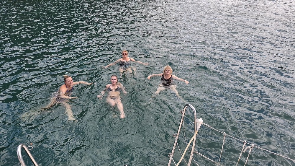 In der Bucht angekommen, war der Tag noch lange nicht vorbei: Anker runter, Badehose an – der Sprung ins türkisfarbene Wasser war der perfekte Abschluss für unseren ersten Urlaubstag.