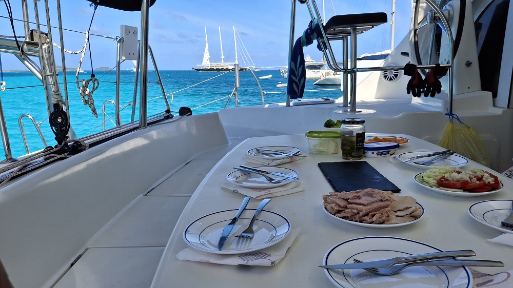 Nur rund 2 Seemeilen trennten uns von unserem nächsten Ziel: Salt Whistle Bay auf Mayreau. Am Vormittag motorten wir gemütlich rüber. Der Strand? Ein echtes Karibikpostkarten-Motiv. Im Gegensatz zu den Muschelstränden der Tobago Cays ist der Sand hier fein und weich – perfekt für einen barfüßigen Spaziergang. Da sich unsere Rückkehr nach Martinique langsam näherte, ließen wir es ruhig angehen. Wir entspannten uns am Strand, genossen die Ruhe und das warme Wetter – ein Tag zum Durchatmen. Am Abend wurde an Bord gekocht. Unsere Lagoon 380 wurde zur schwimmenden Küche, das Meer zur Kulisse für einen entspannten Ausklang unter den Sternen.