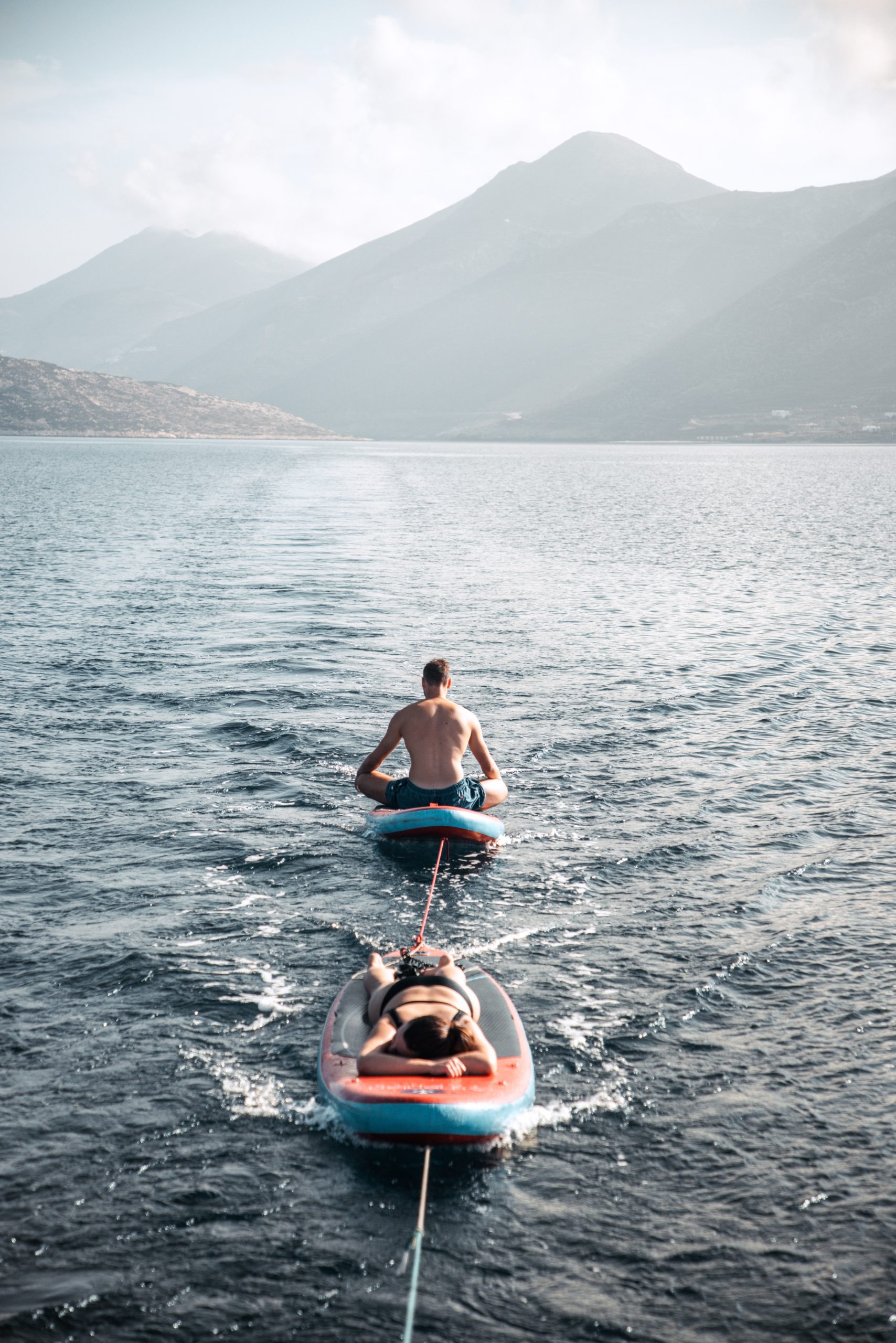 Kurz vor Mittag brachen wir auf. Die See war ruhig, der Wind schwach, sodass wir größtenteils unter Motor fuhren. Zwei Crewmitglieder banden ihre Stand-up-Paddles am Heck fest und ließen sich während der Fahrt gemütlich hinterherziehen.