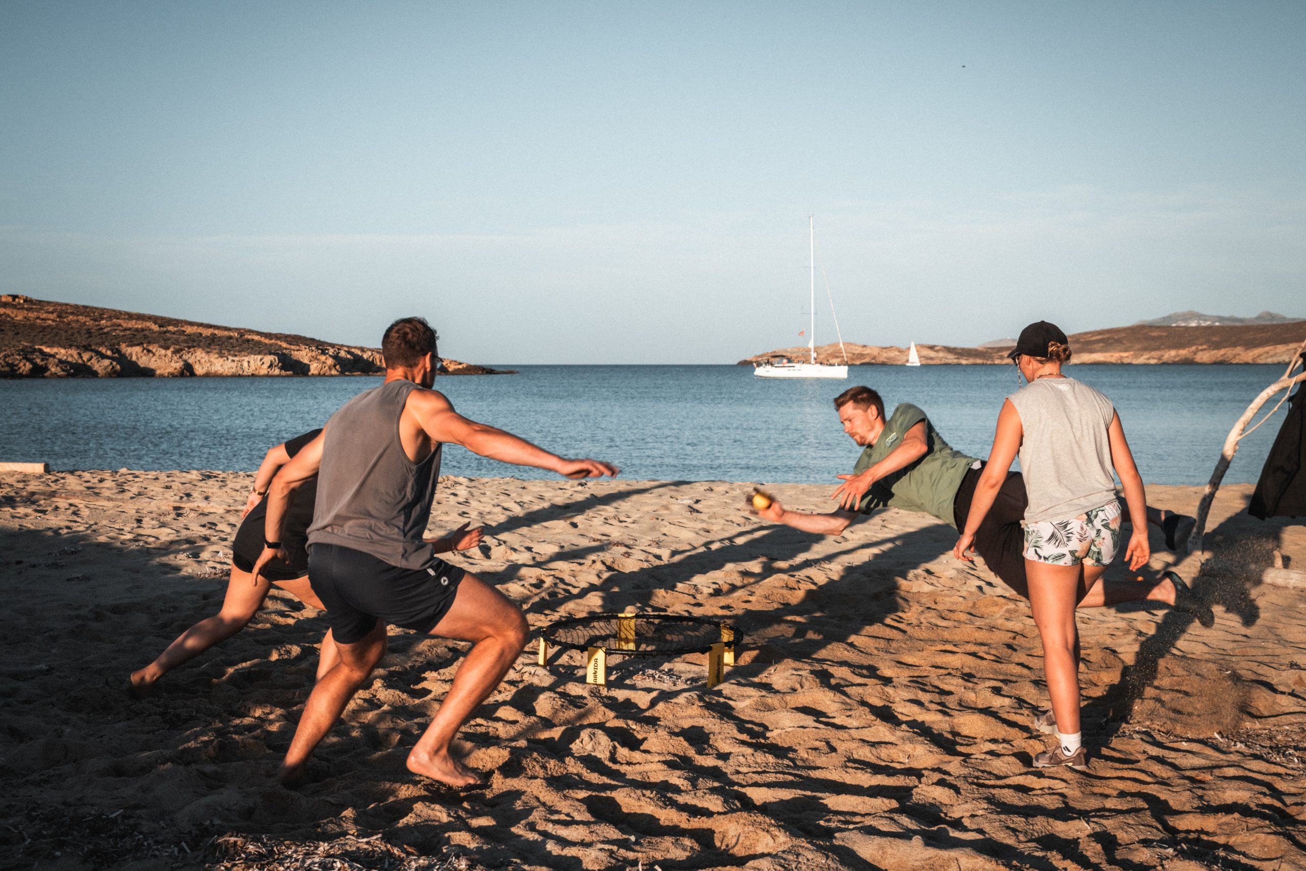 Um unseren abendlichen Ankerplatz noch zu erreichen, setzten wir Kurs Richtung Norden. Unser Ziel war die bekannte Bucht Paralia Pori vor Pano Koufonisi, die (angeblich) als eine der schönsten der Kykladen gilt. Wir erreichten den Strand kurz vor Sonnenuntergang. Das Wasser war intensiv blau, der Grund sichtbar, und es lagen nur eine Handvoll Boote vor Ort. Da das Ankern direkt funktionierte, schwammen wir noch an den Strand und spielten Spikeball bis es dunkel war.