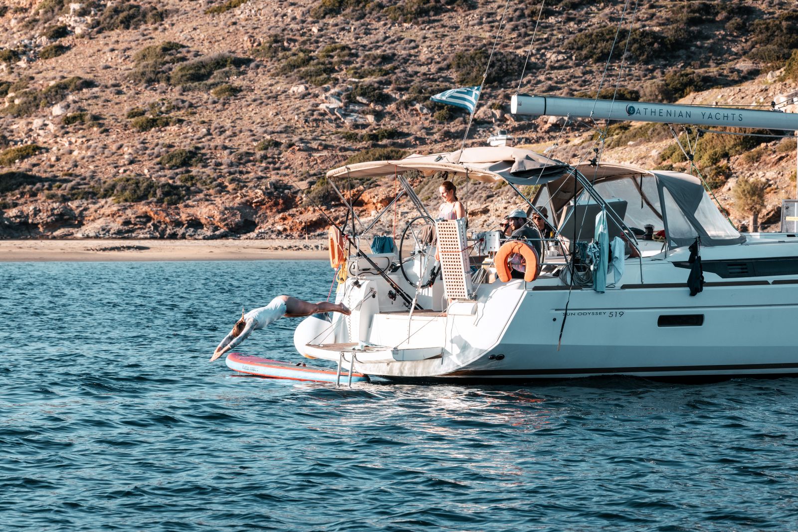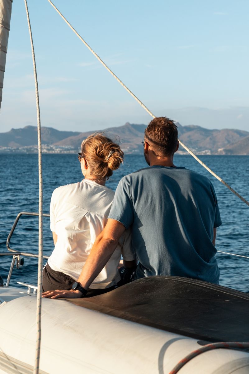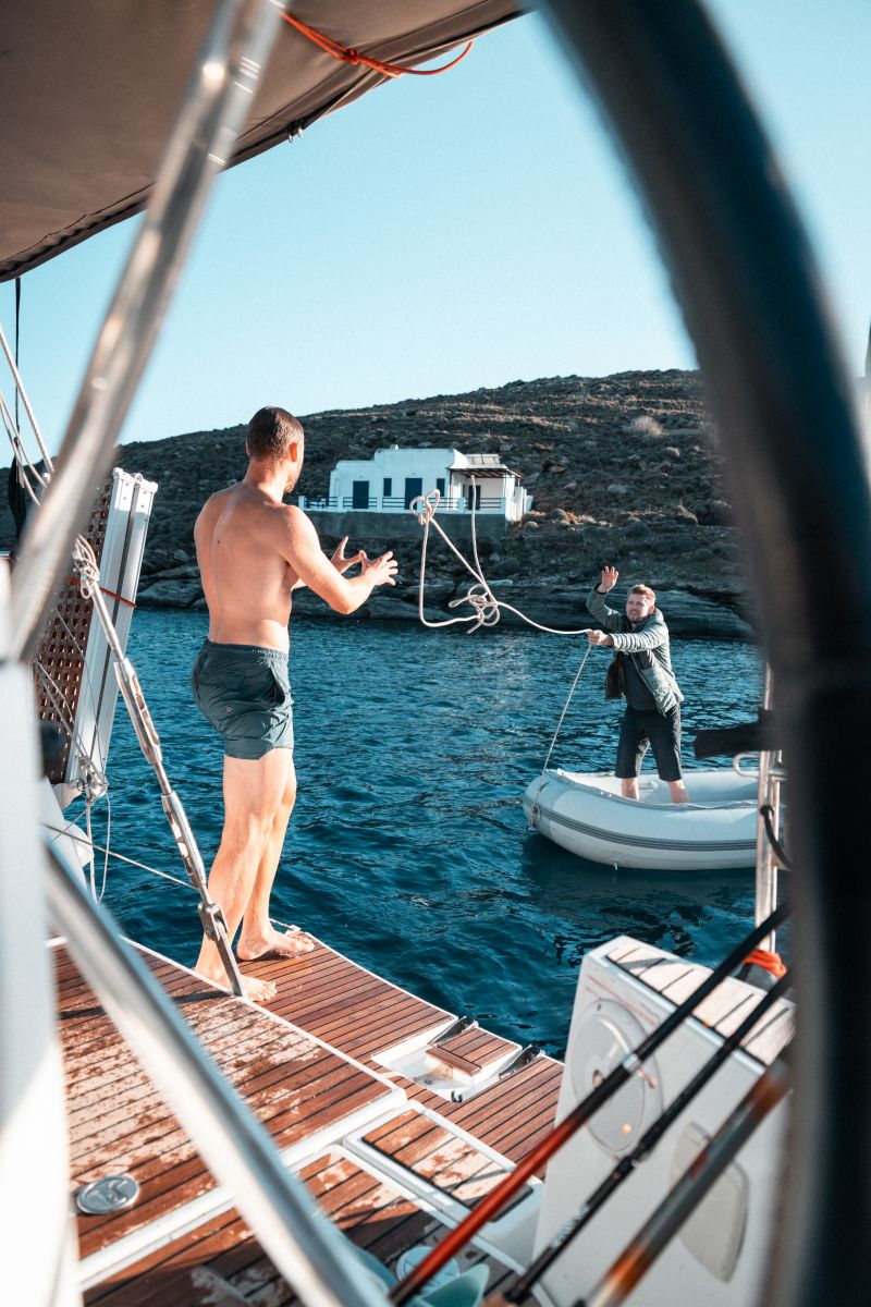 Am frühen Abend erreichten wir unseren nächsten Ankerplatz vor Nikouria Beach. In der Bucht entschied Steffen, die Crew aktiv ins Ankern einzubinden, was sehr positiv aufgenommen wurde. Da es für einige von uns der erste Segeltörn war, wollte jeder möglichst viel lernen und für sich mitnehmen. Der Untergrund erwies sich als widerspenstig und wir benötigten mehrere Anläufe, bis der Anker hielt. Der Tag endete entspannt an Bord, mit einem gemeinsamen Abendessen und Gesprächen über die nächsten Etappen.