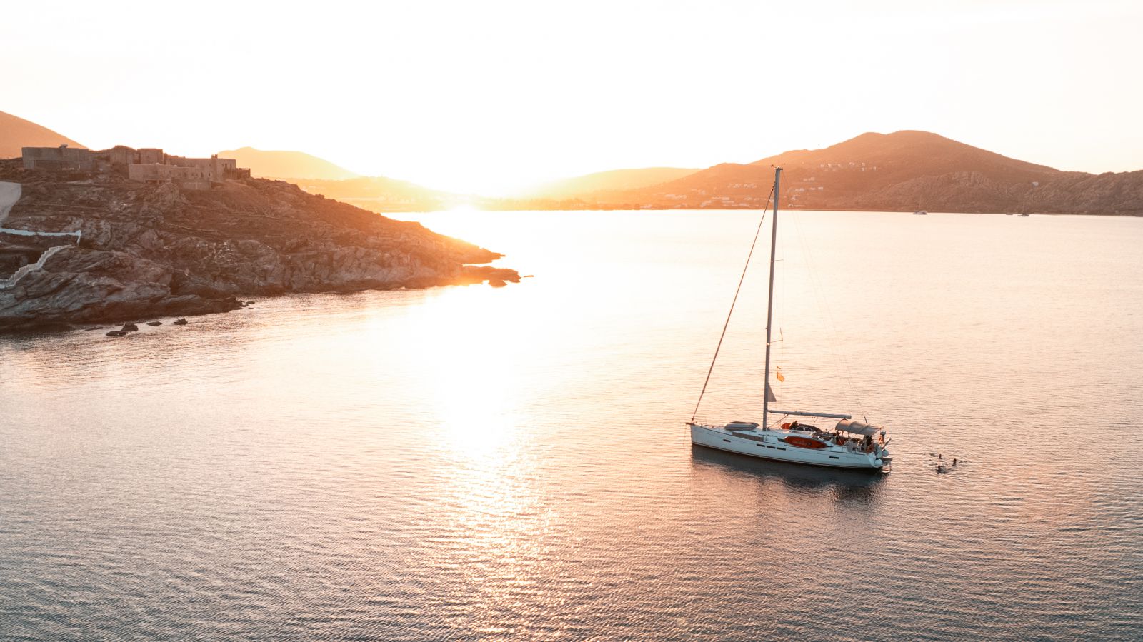 Am späten Nachmittag waren wir alle müde vom Kiten und machten uns wieder auf den Weg zurück in die Ankerbucht vor Nisída Dipló, um dort die Nacht zu verbringen. Die Umgebung war ruhig, die Inseln lagen wie gestapelt um uns herum, und das Licht am Abend war besonders klar. Einige von uns gingen noch schwimmen, andere saßen an Deck und ließen den Tag Revue passieren.