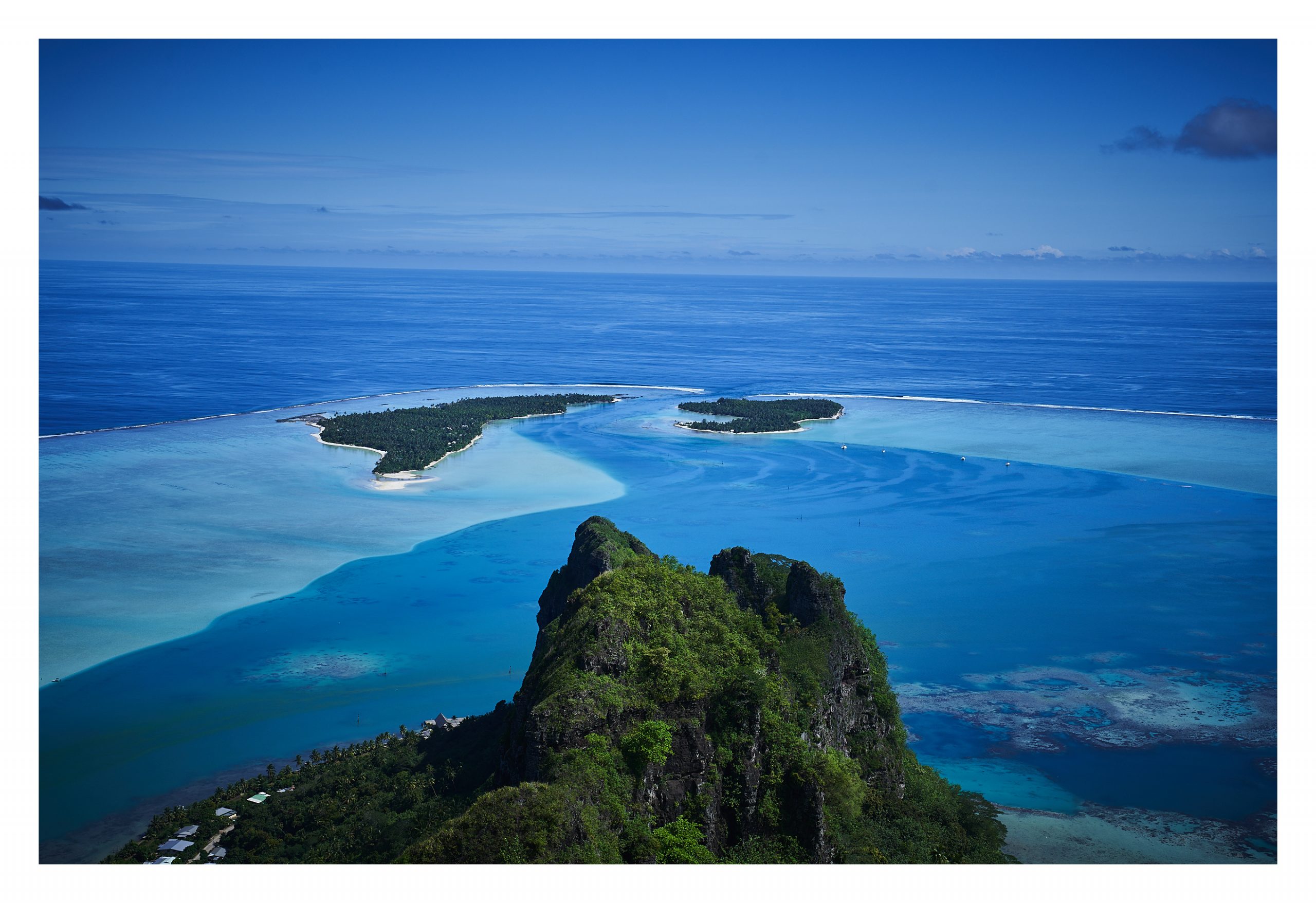 Der Aufstieg hat sich gelohnt: Ausblick vom Mont Te’urafa’atiu auf die Inseln Motu Pitiahe und Tiapaa und die blaue Ferne außerhalb des Korallengürtels.