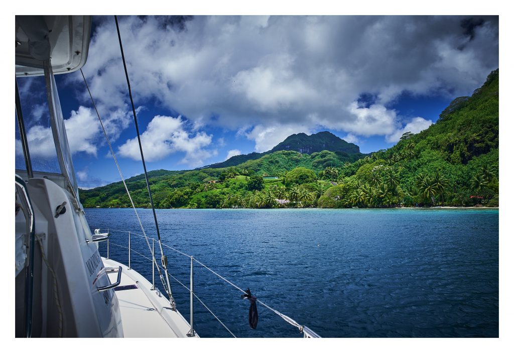 Am folgenden Tag fahren wir durch unsere erste Passage Paipai gegenüber der Baie de Hurepiti aufs offene Meer und rund 15 Seemeilen nordwestlich nach Bora Bora. Sobald wir auf dem offenen Meer sind, werden die Wellen höher und langgezogener. Das Wetter ist bewölkt und es regnet immer wieder. Nach drei Stunden Überfahrt meistern wir unsere nächste Passage, Teavanui, und fahren weiter über die Nordseite auf die Ostseite von Bora Bora. Das türkisblaue Wasser mit Rochen und die wunderschöne Silhouette von Bora Bora können wir jedoch erst später richtig genießen. Denn zuerst müssen wir uns auf die Navigation konzentrieren. Der Tiefgang liegt teilweise bei 1,30 Meter und so üben wir uns in diesem Abschnitt fleißig in der Augapfel-Navigation.