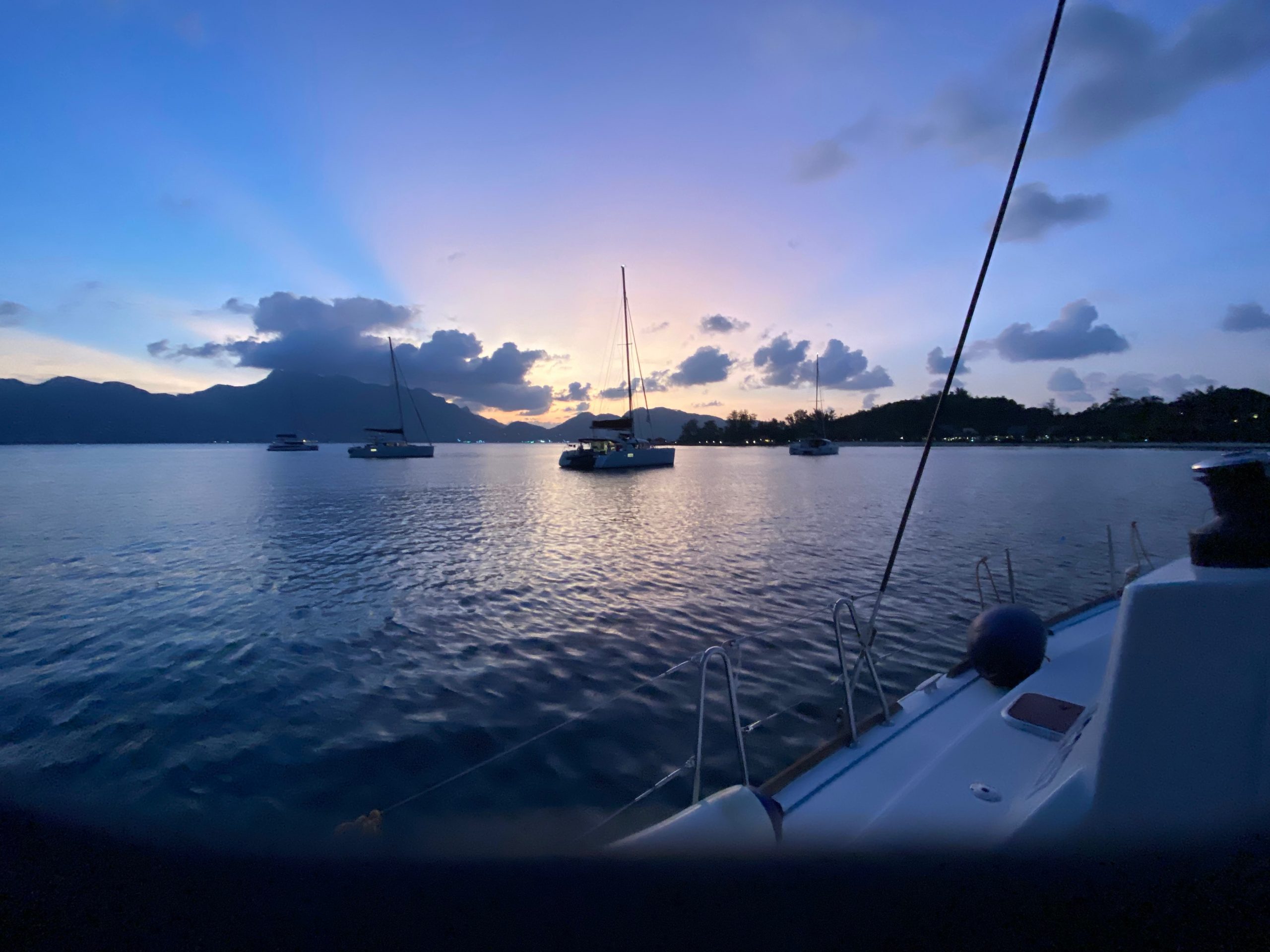 Nach der Übergabe motorten wir gegen 16 Uhr die kurze Strecke bis zum Saint-Anne Marinepark und ließen den Anker in der Höhe der Île Ronde fallen, rechtzeitig zum erfrischenden Schwimmen (29° Wassertemperatur) nach dem anstrengenden Tag und zum Sundowner. Die Übernachtung kostet 250 SCR (Seychellen-Rupien); am nächsten Morgen werden nach 9 Uhr pro Person 200 SCR für den Tag fällig, was das übliche Vorgehen bei fast allen Marine Parks zu sein scheint. Die Ranger sind allerdings sehr entspannt beim Geldeintreiben.