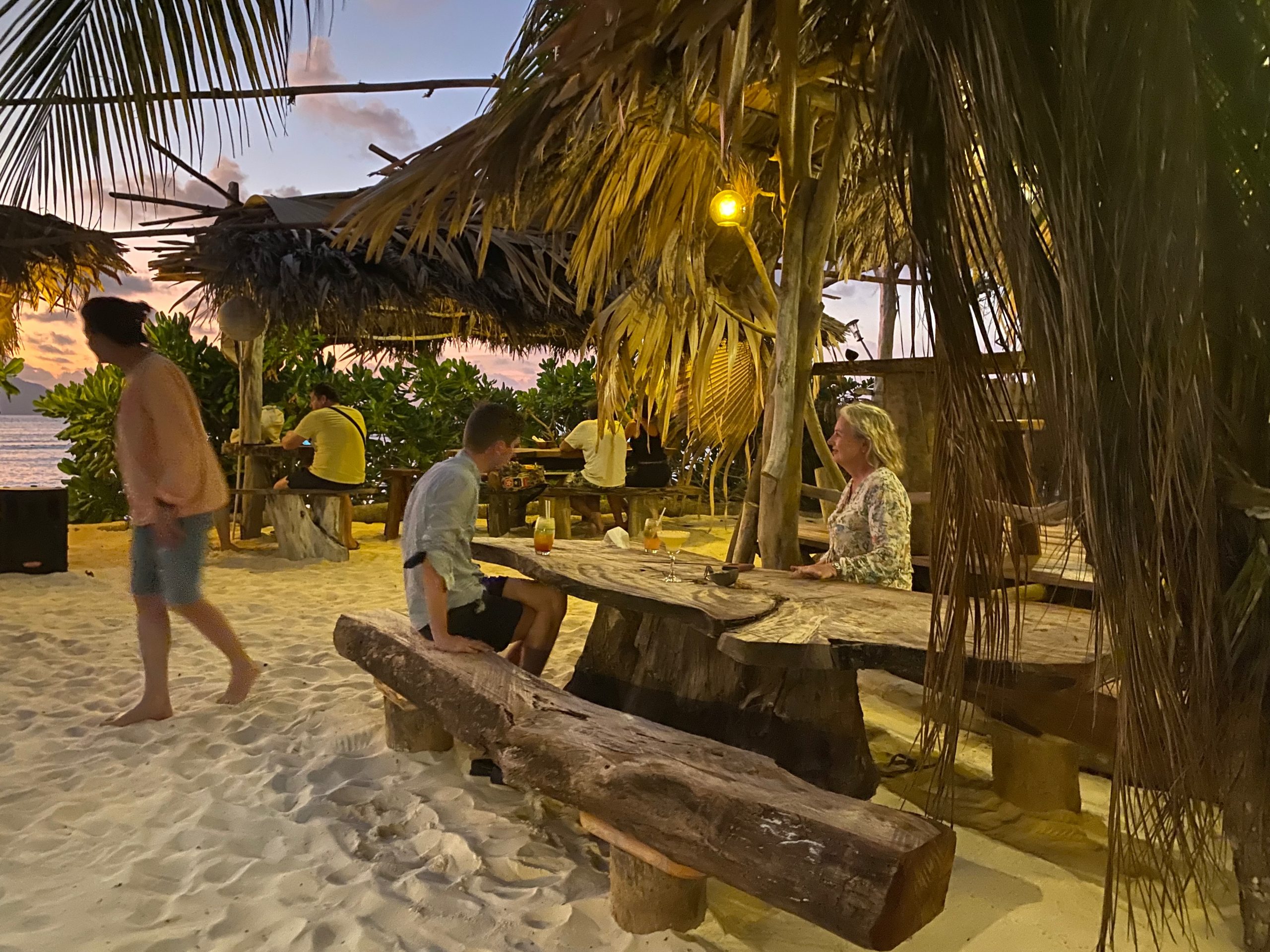 Da wir zu faul waren, abends zu kochen, reservierten wir im Hotel einen Tisch. Tatsächlich waren wir abends häufiger faul, da die Hitze auch nicht zu ausgiebigen Kochaktionen einlud. Nach dem Sundowner, den wir jeden Abend zelebrierten, da ein Sonnenuntergang schöner war als der nächste, gab es häufig Salat und kalte Küche mit Ceviche oder Tatar vom fangfrischen rohen Thunfisch. Etwas vermisst haben wir einen Außengrill, der für die Zubereitung von frisch gefangenem Fisch wirklich sehr praktisch ist. Das Essen im Hotel war gut. Relativ teuer, wie häufig in den Hotelanlagen (600 SCR pro Person), aber man sitzt sehr schön auf einer Seebrücke, die ins Meer hinausragt.