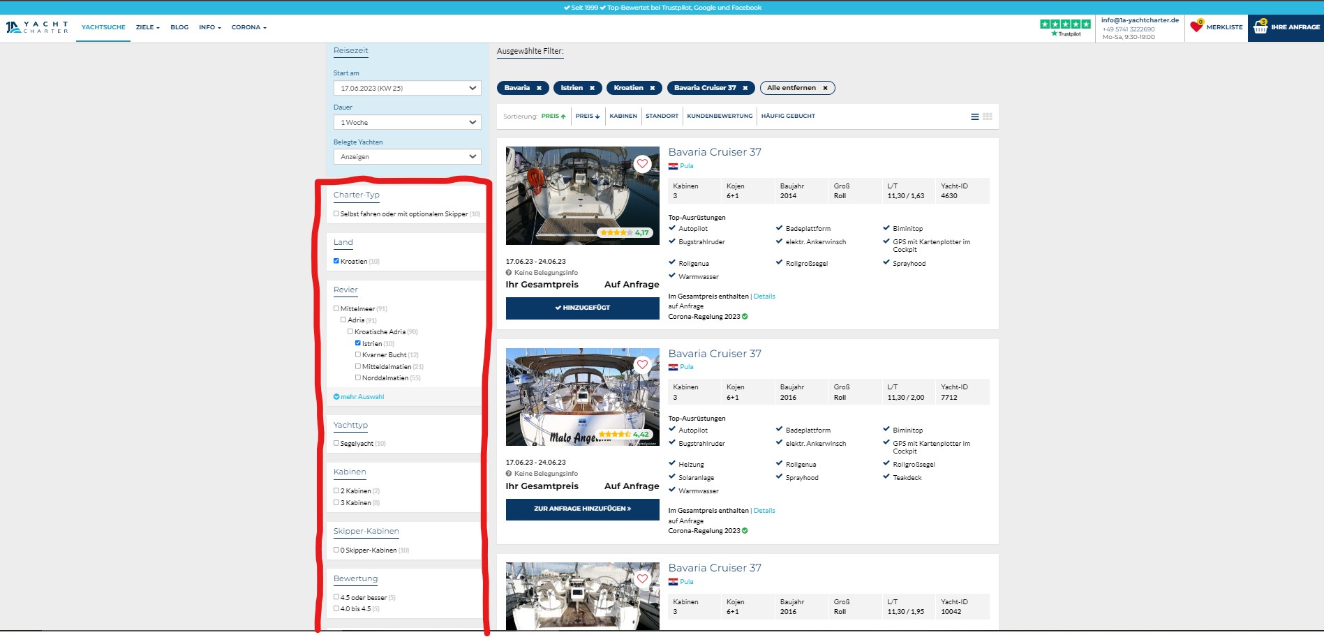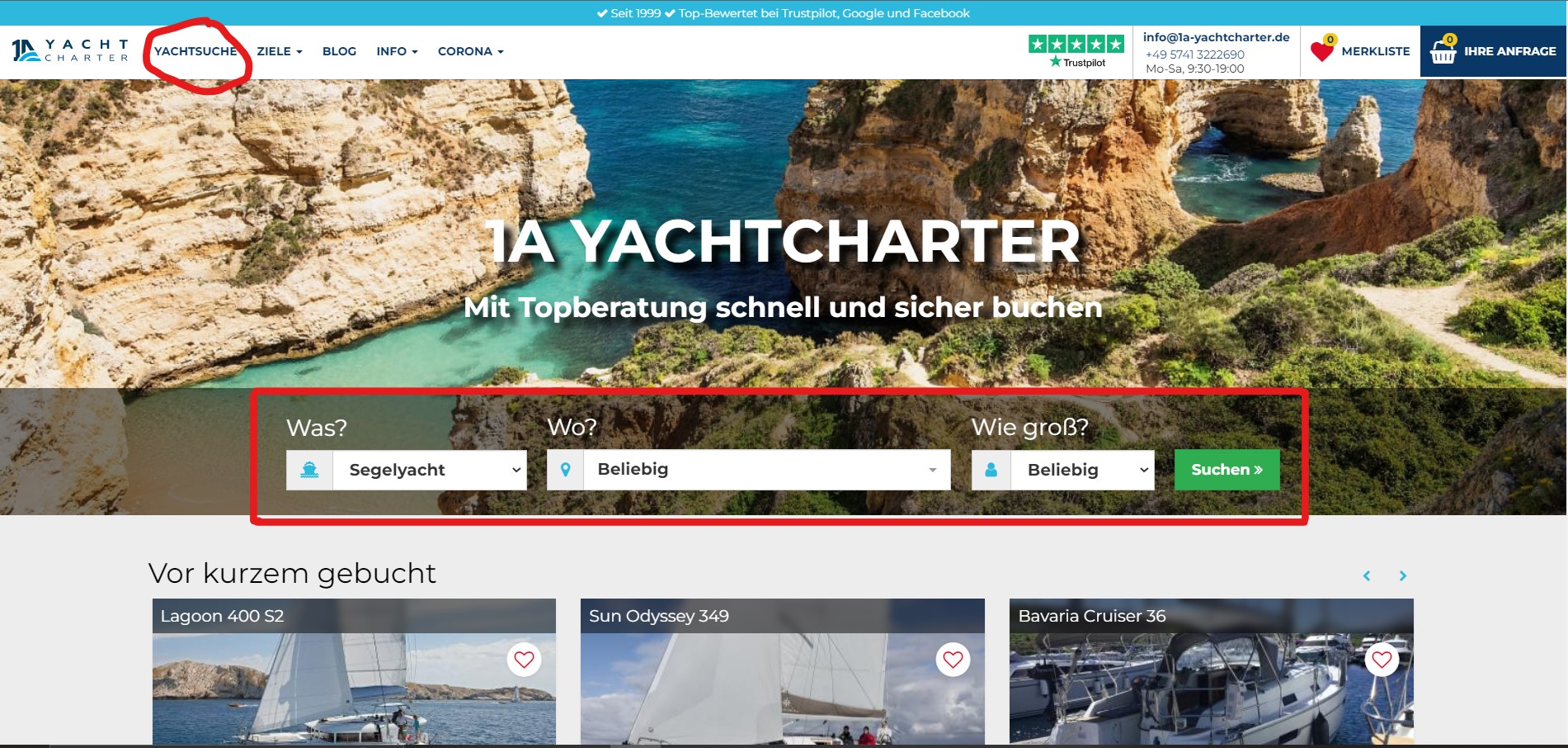 Auf unserer Webseite kommen Sie über den Reiter „Yachtsuche“ in der oberen Leiste zu unserer Profisuche oder Sie nutzen das Kurz-Feld direkt auf der Startseite.