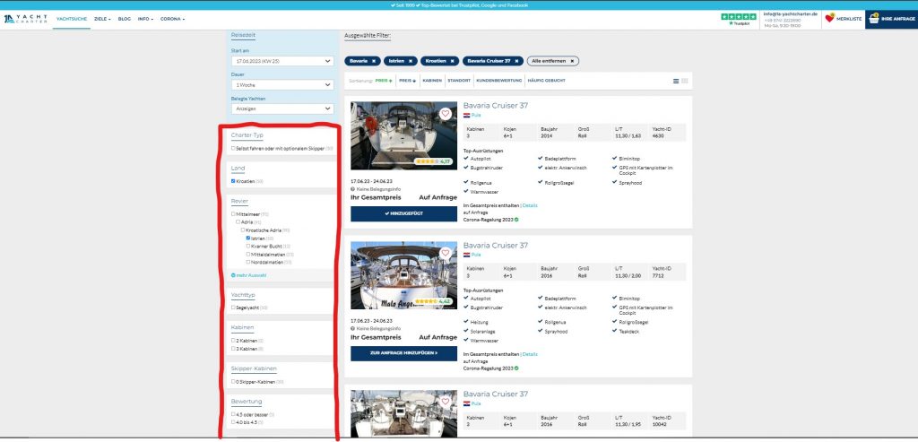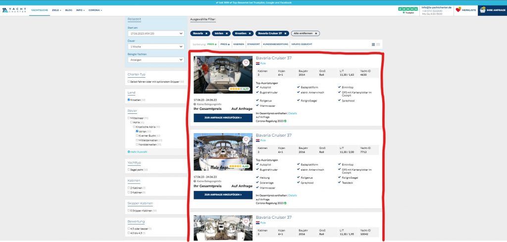 Wenn Sie auf einzelne Yachten klicken, kommen Sie auf die Detailseite mit allen Informationen und Bildern zur Yacht.