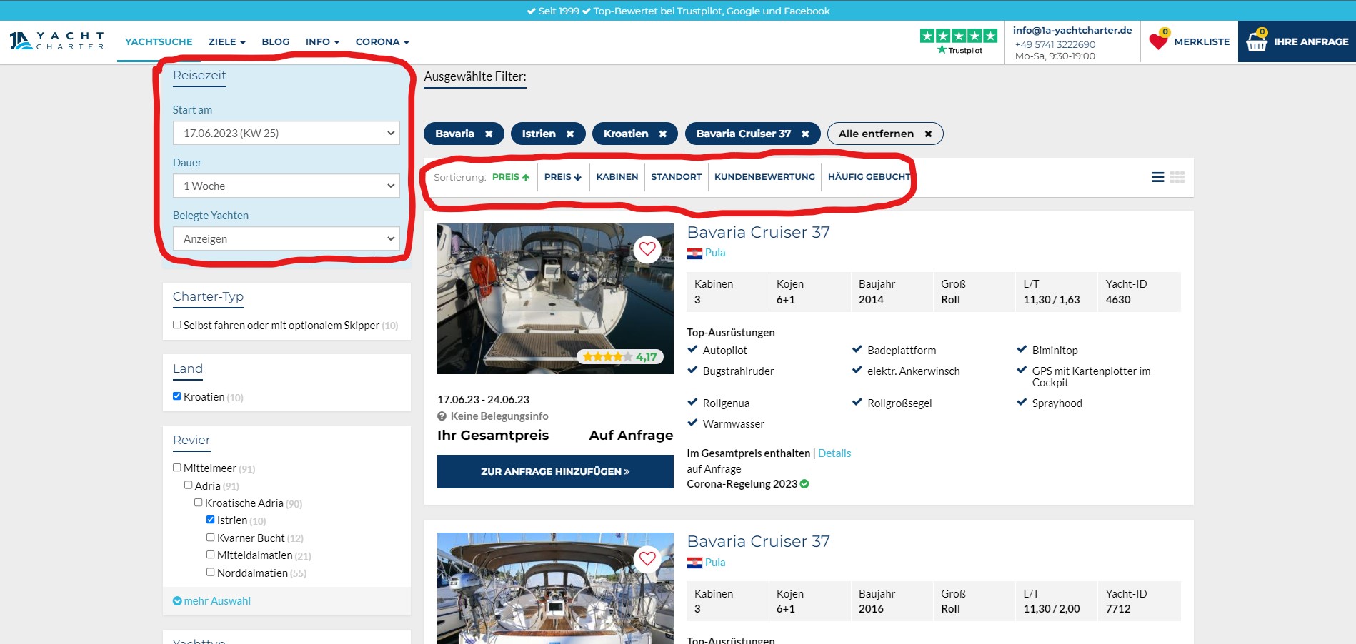 Über den Yachten können Sie die Sortierung einstellen, nach Preis, Kabinen, Standort, Kundenbewertung oder häufig gebuchten Yachten.
