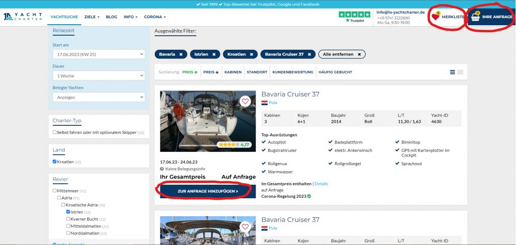 Aus der Yachtauflistung können Sie nun über den Reiter „Zur Merkliste“ Ihre Wunschauswahl sammeln oder gleich über den Button „Zur Anfrage hinzufügen“ eine konkretere Auswahl treffen. Ihre Anfrageauswahl können Sie über die obere Reiterleiste über „Ihre Anfrage“ sehen.