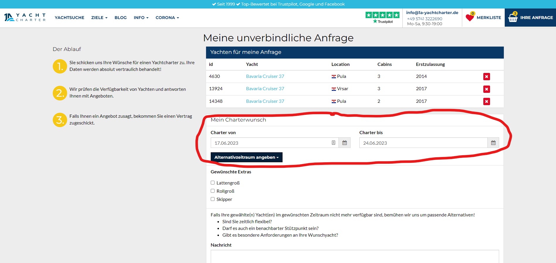 Ihre unverbindliche Anfrage können Sie nun mit Ihrer Auswahl und weiteren Informationen an uns schicken. Wir prüfen die Yachten auf den aktuellen Tagespreis, ob sie definitiv frei sind und suchen weitere Angebote heraus, die auf Ihre Kriterien und den Zeitraum zutreffen.