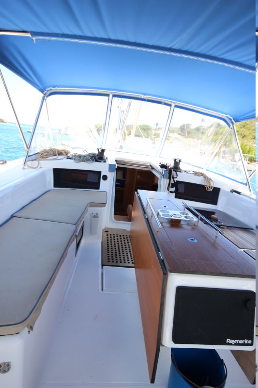 | Outside | Biminitop, Cockpittisch, elektr. Ankerwinsch, Grill, Solaranlage, Sprayhood, Teak im Cockpit |