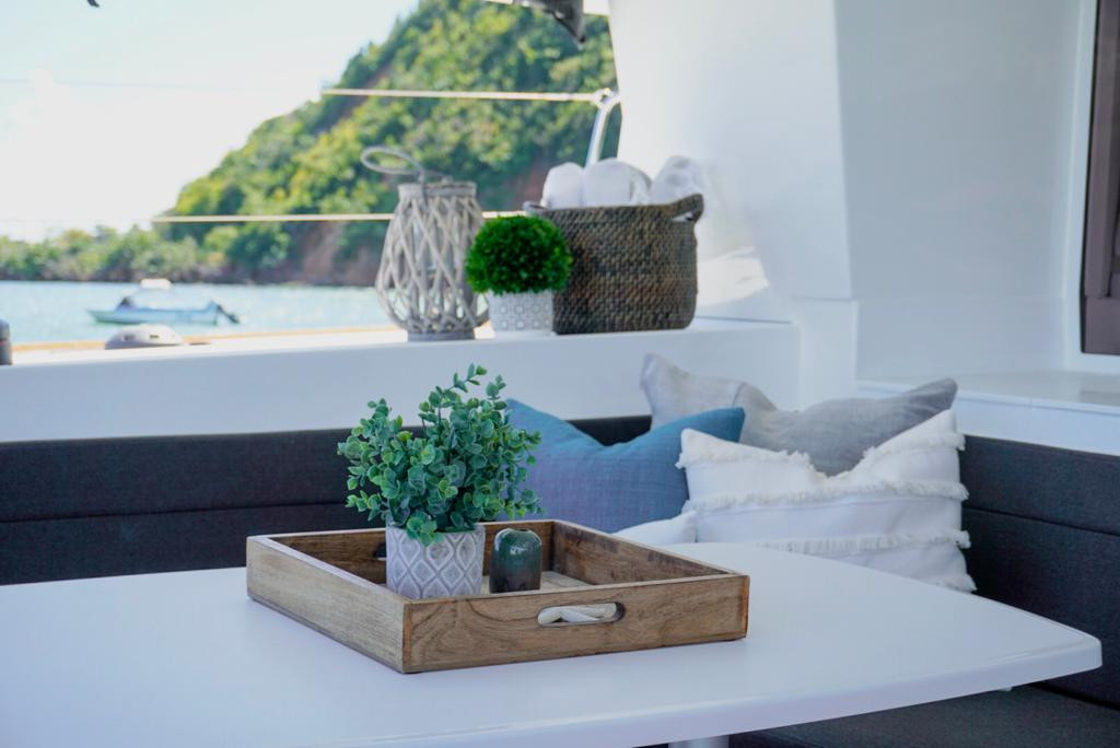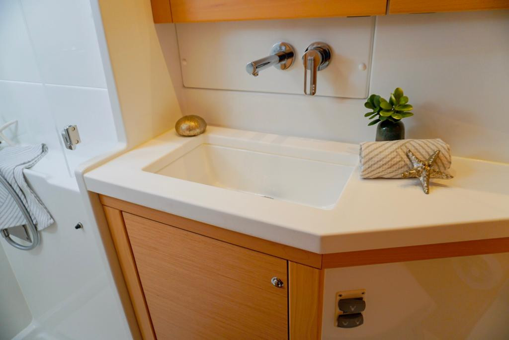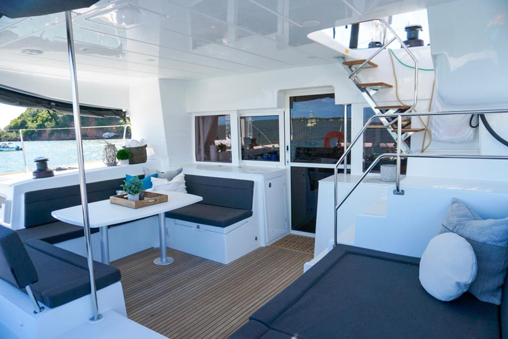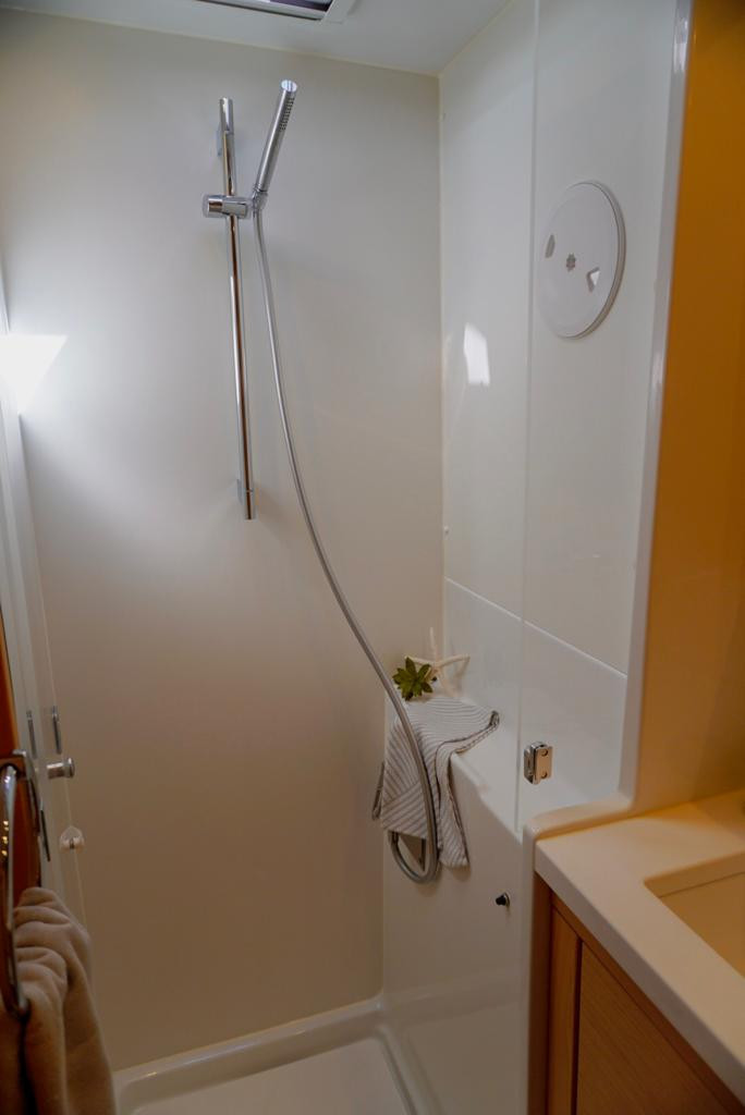 | Outside | Badeleiter, Biminitop, Cockpitdusche warm/kalt, Cockpitkühlschrank, Cockpitlautsprecher, Cockpitpolster, Cockpittisch, Cockpittisch mit Eisbox, Davits, elektr. Ankerwinsch, elektr. Winsch, Selbstholende Winschen, Solaranlage, Teak im Cockpit |